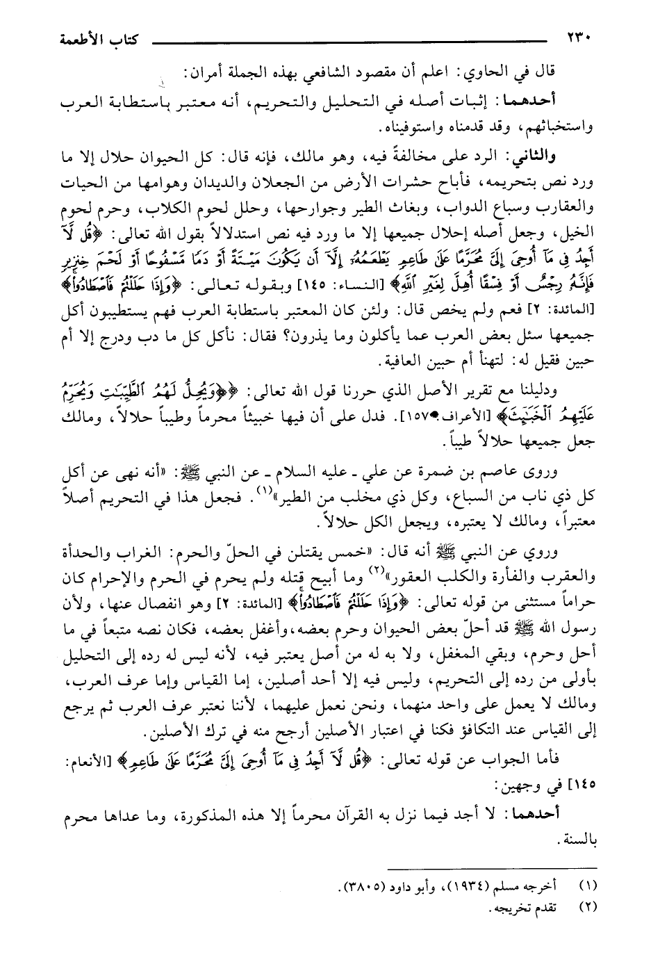 والتاني: الرد على مخالفة فيه، وهو مالك، فإنه قال: كل الحيوان حلال إلا ما ورد نص بتحريمه، فأباح حشرات الأرض من الجعلان والديدان وهوامها من الحيات والعقارب وسباع الدواب، وبغاث الطير وجوارحها، وحلل لحوم الكلاب، وحرم لحوم الخيل، وجعل أصله إحلال جميعها إلا ما ورد فيه نص استدلالاً بقول الله تعالى: {قُل لاَّ أَجِدُ فِي مَا أُوْحِيَ إِلَيَّ مُحَرَّماً عَلَى طَاعِمٍ يَطْعَمُهُ إِلاَّ أَن يَكُونَ مَيْتَةً أَوْ دَماً مَّسْفُوحاً أَوْ لَحْمَ خِنزِيرٍ فَإِنَّهُ رِجْسٌ أَوْ فِسْقاً أُهِلَّ لِغَيْرِ اللهِ} [الأنعام: 145] وبقوله تعالى: {وَإِذَا حَلَلْتُمْ فَاصْطَادُوا} [المائدة: 2] فعم ولم يخص قال: ولئن كان المعتبر باستطابة العرب فهم يستطيبون أكل جميعها سئل بعض العرب عما يأكلون وما يذرون؟ فقال: نأكل كل ما دب ودرج إلا أم حبين فقيل له: لتهنأ آم حبين العافية.