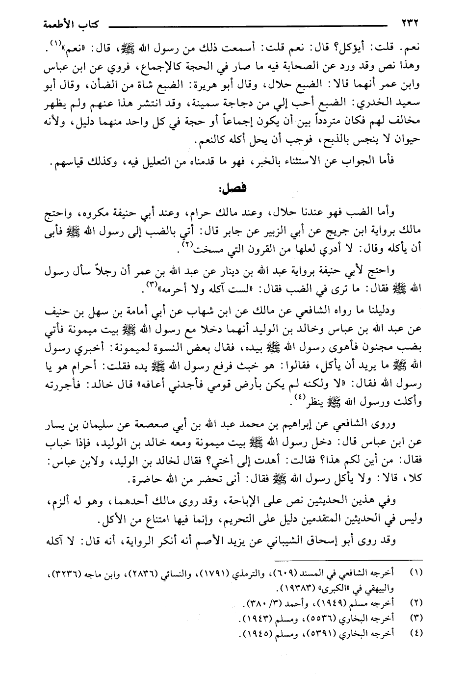 وروى الشافعي عن إبراهيم بن محمد عبد الله بن أبي صعصعة عن سليمان بن يسار عن ابن عباس قال: دخل رسول الله - صلى الله عليه وسلم - بيت ميمونة ومعه خالد بن الوليد، فإذا خباب فقال: من أين لكم هذا؟ فقالت: أهدت إلى أختي؟ فقال لخالد بن الوليد، ولابن عباس: كلا، قالا: ولا يأكل رسول الله - صلى الله عليه وسلم - فقال: أنى تحضر من الله حاضرة.