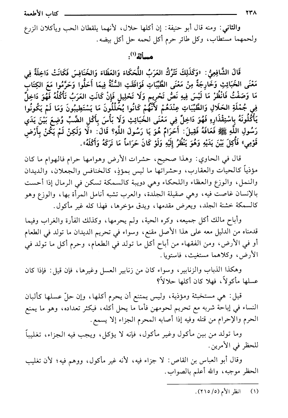 قال الشافعي: "وكذلك تترك العرب اللحكاء والعظاء والخنافس فكانت داخله في معنى الخبائث وخارجه من معنى الطيبات فوافقت السنه فيما أحلوا وحرموا مع الكتاب ما وصفت فانظر ما ليس فيه نص تحريم ولا تحليل فان كانت العرب تأكله فهو داخل في جمله الحلال والطيبات عندهم لأنهم كانوا يحللون ما يشتطيبون وما لم يكونوا يأكلونه باستقذاره فهو داخل في معنى الخبائث ولا بأس بأكل الضب وضع بين يدي رسول الله - صلى الله عليه وسلم - فعافه فقيل: أحرام هو يا رسول الله؟ قال: "لا ولكن لم يكن بأرض قومي" فأكل بين يديه وهو ينظر إليه ولو كان حراما ما تركه وأكله".