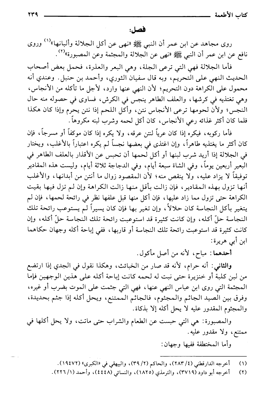 روى مجاهد عن ابن عمر أن النبي - صلى الله عليه وسلم - "نهى عن أكل الجلالة وألبانها" وروى نافع عن ابن عمر ان النبي ... - صلى الله عليه وسلم - "نهى عن الجلالة والمجثمة وعن المصبورة ".