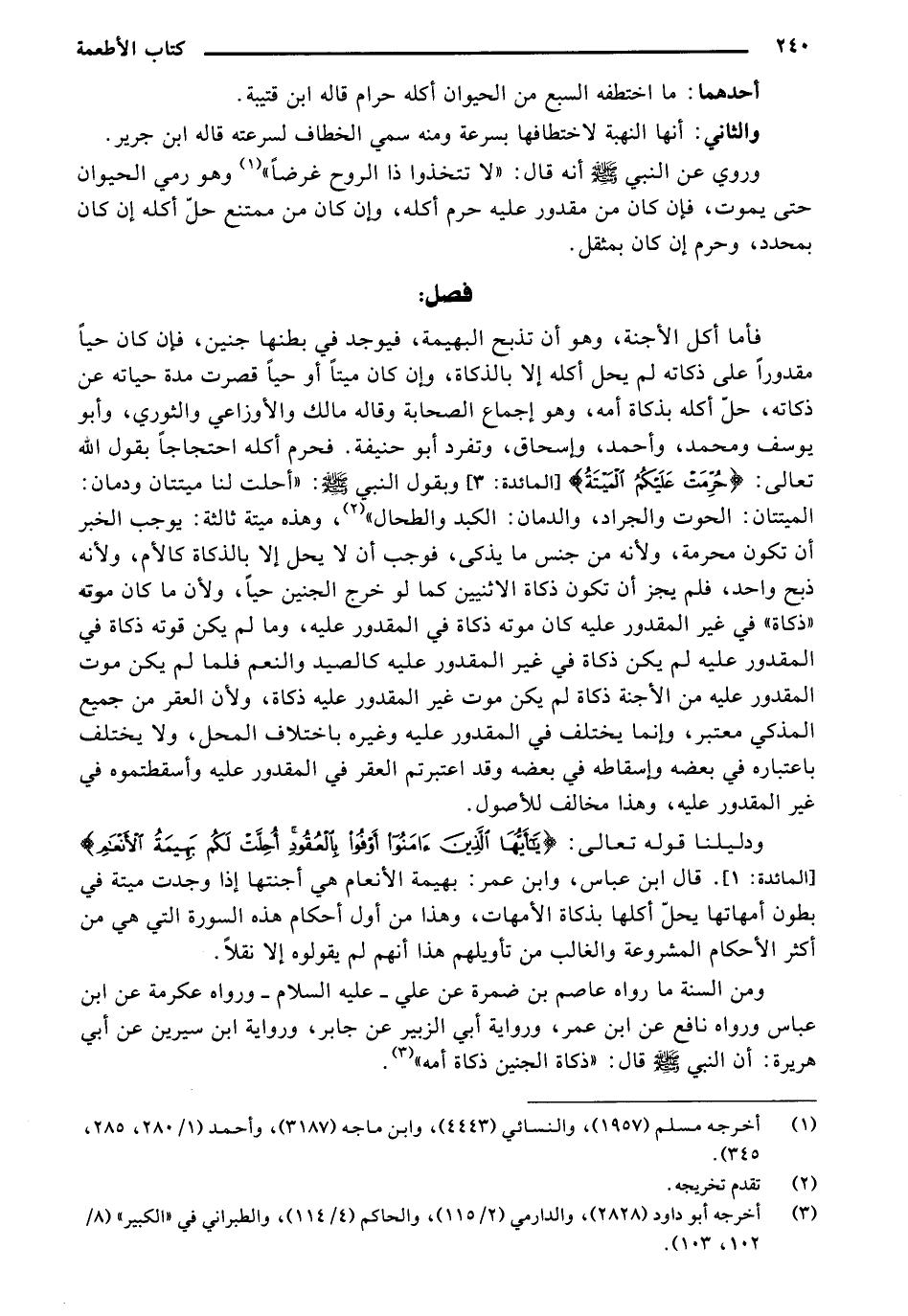 ومن السنة ما رواه عاصم بن ضمرة عن علي - عليه السلام - ورواه عكرمة عن ابن عباس ورواه نافع عن ابن عمر، ورواية أبي الزبير عن جابر، ورواية ابن سيرين عن أبي هريرة: ان النبي - صلى الله عليه وسلم - قال: "ذكاة الجنين ذكاة أمه".