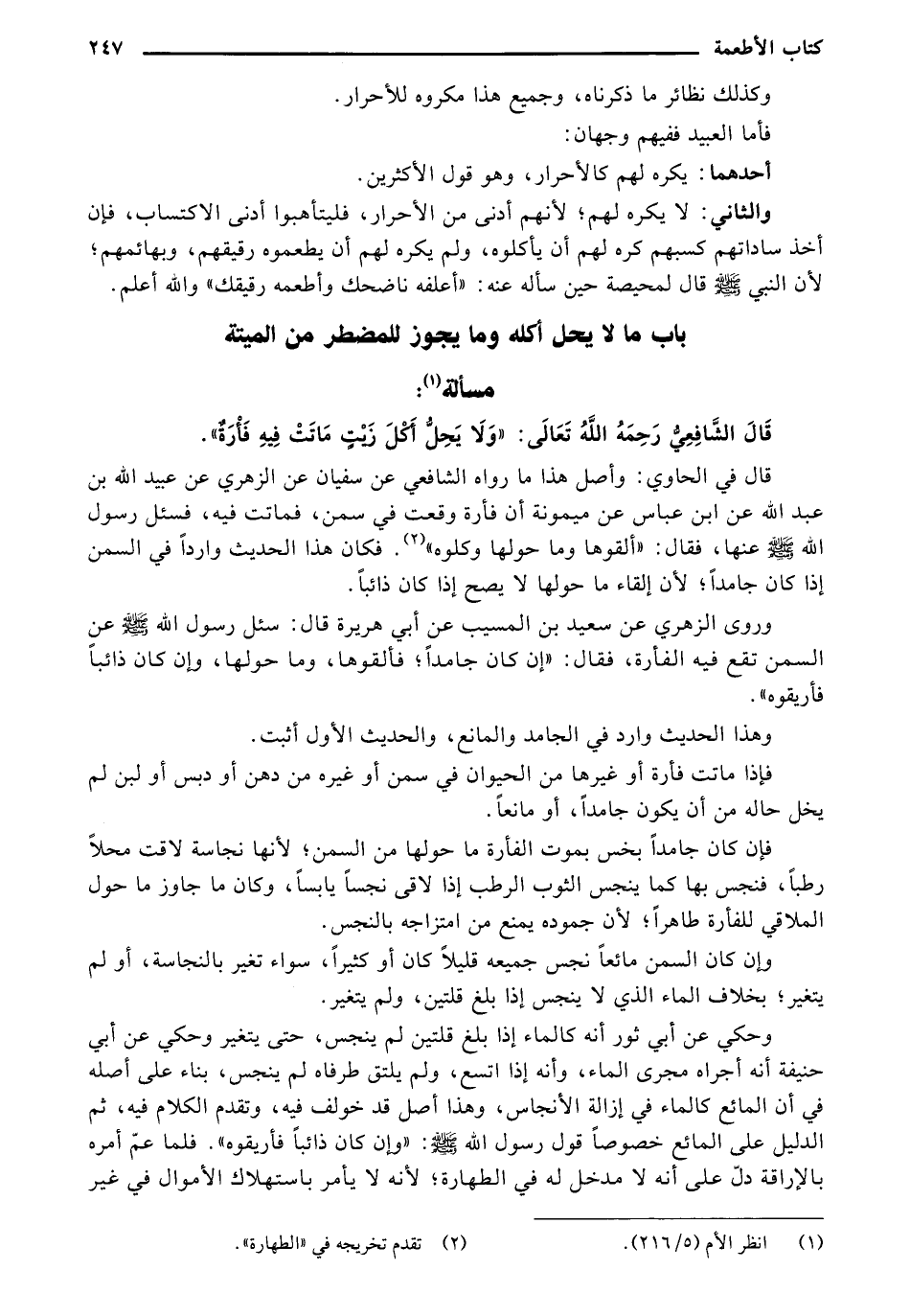 قال الشافعي رحمه الله تعالى: "ولا يحل أكل زيت ماتت فيه فأرة" ..