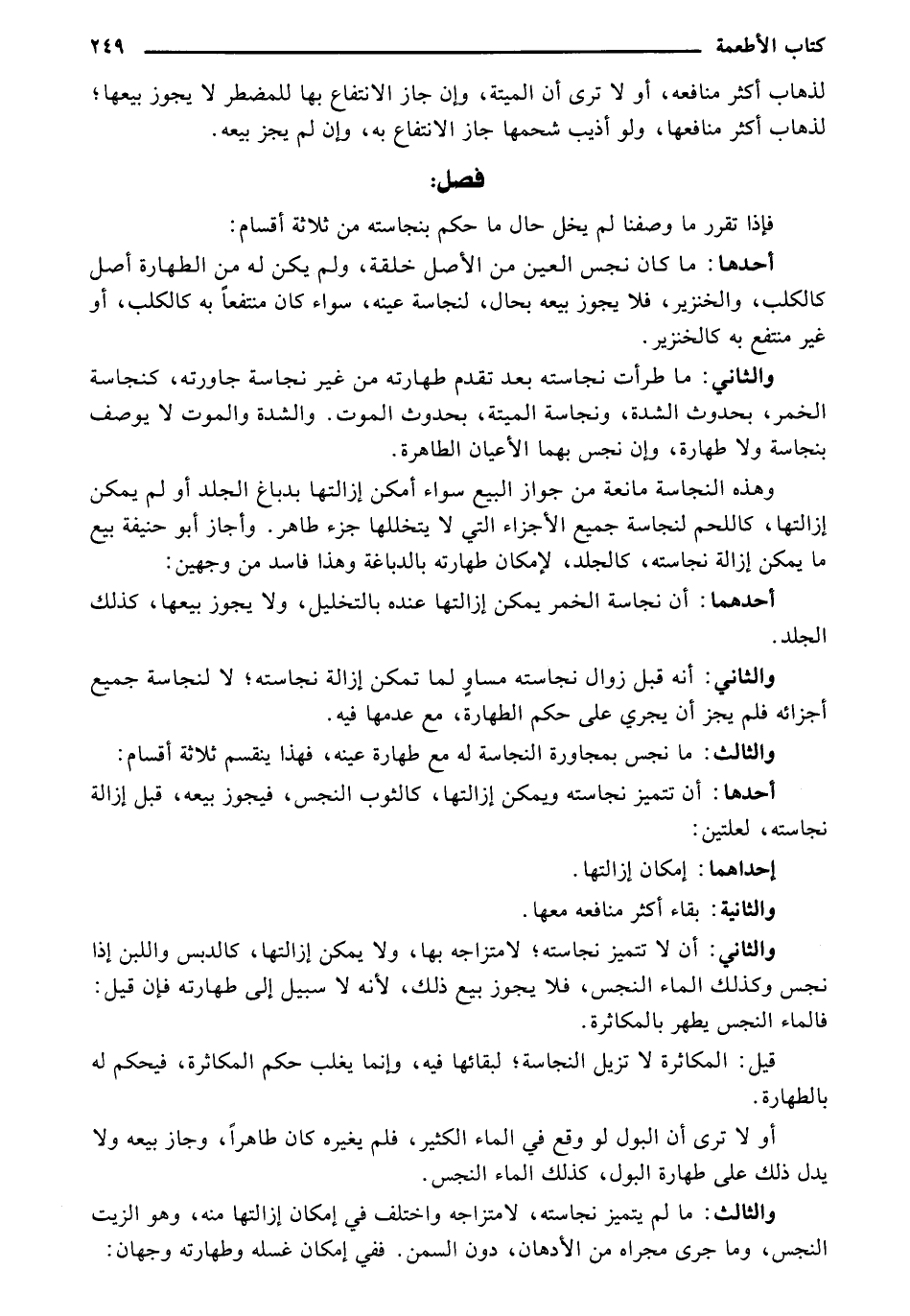 والثاني: أن لا تتميز نجاسته؛ لامتزاجه بهاء ولا يمكن إزالتها، كالدبس واللبن إذا نجس وكذلك الماء النجس، فلا يجوز بيع ذلك، لأنه لا سبيل إلى طهارته فإن قيل: فالماء النجس يطهر بالمكاثرة.