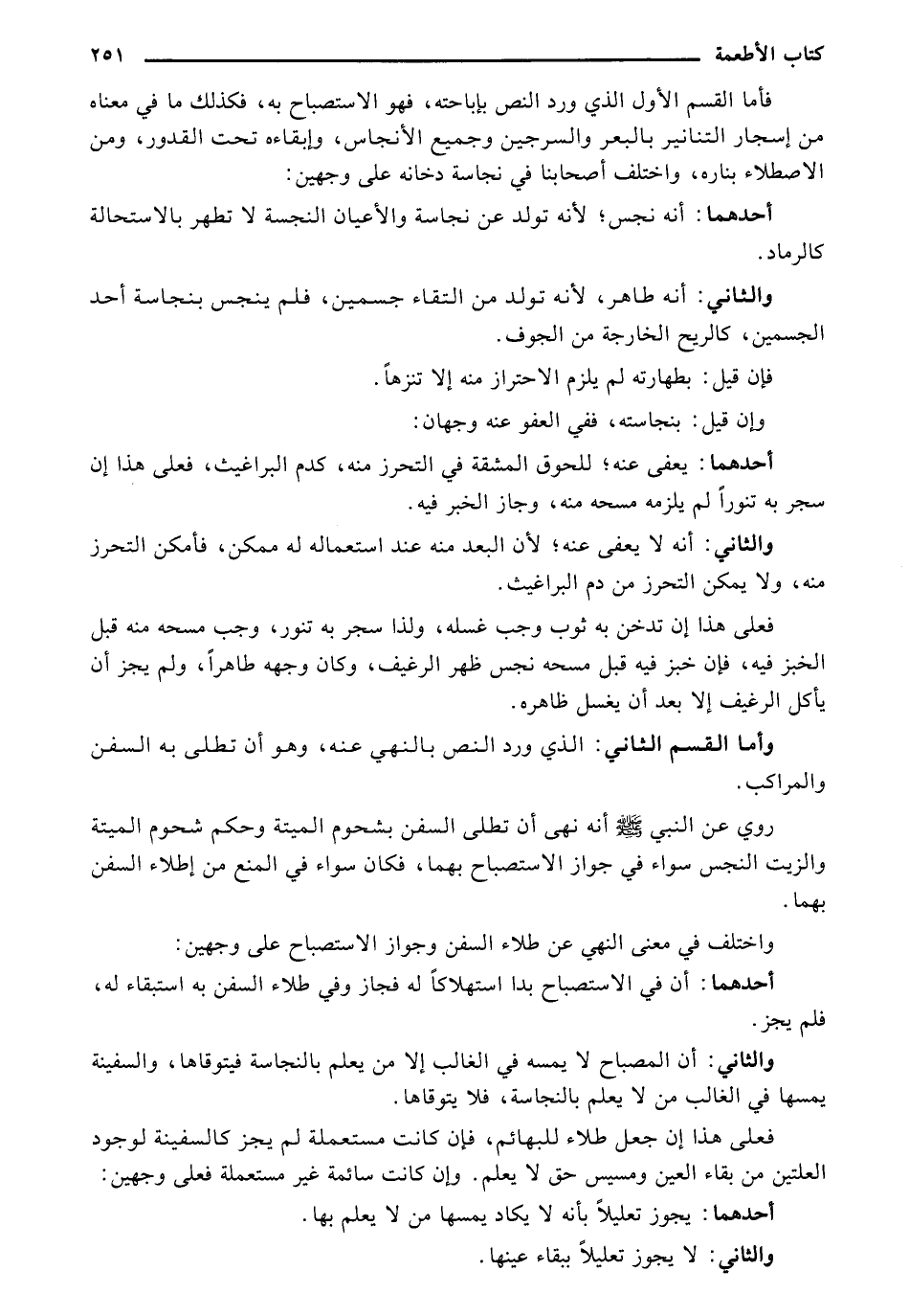 فأما القسم الأول الذي ورد النص بإباحته، فهو الاستصباح به، فكذلك ما في معناه من إسجار التنانير بالبعر والسرجين وجميع الأنجاس، وإبقاءه تحت القدور، ومن الاصطلاء بناره، واختلف أصحابنا في نجاسة دخانه على وجهين: