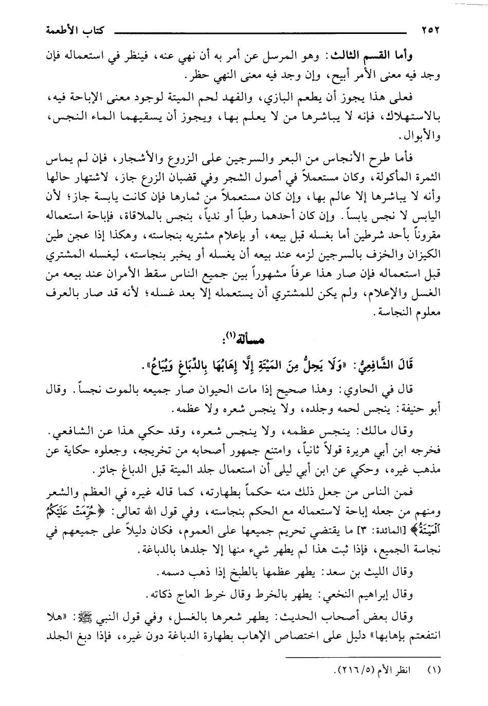 قال الشافعي: " ولا يحل من الميته إلا إهابها بالدباغ ويباع "