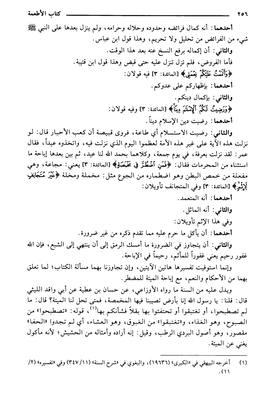 وإنما استوفيت تفسيرها هاتين الآيتين، وإن تجاوزنا بهما مسألة الكتاب؛ لما تعلق بهما من الأحكام والنعم، مع إباحة الميتة للمضطر.