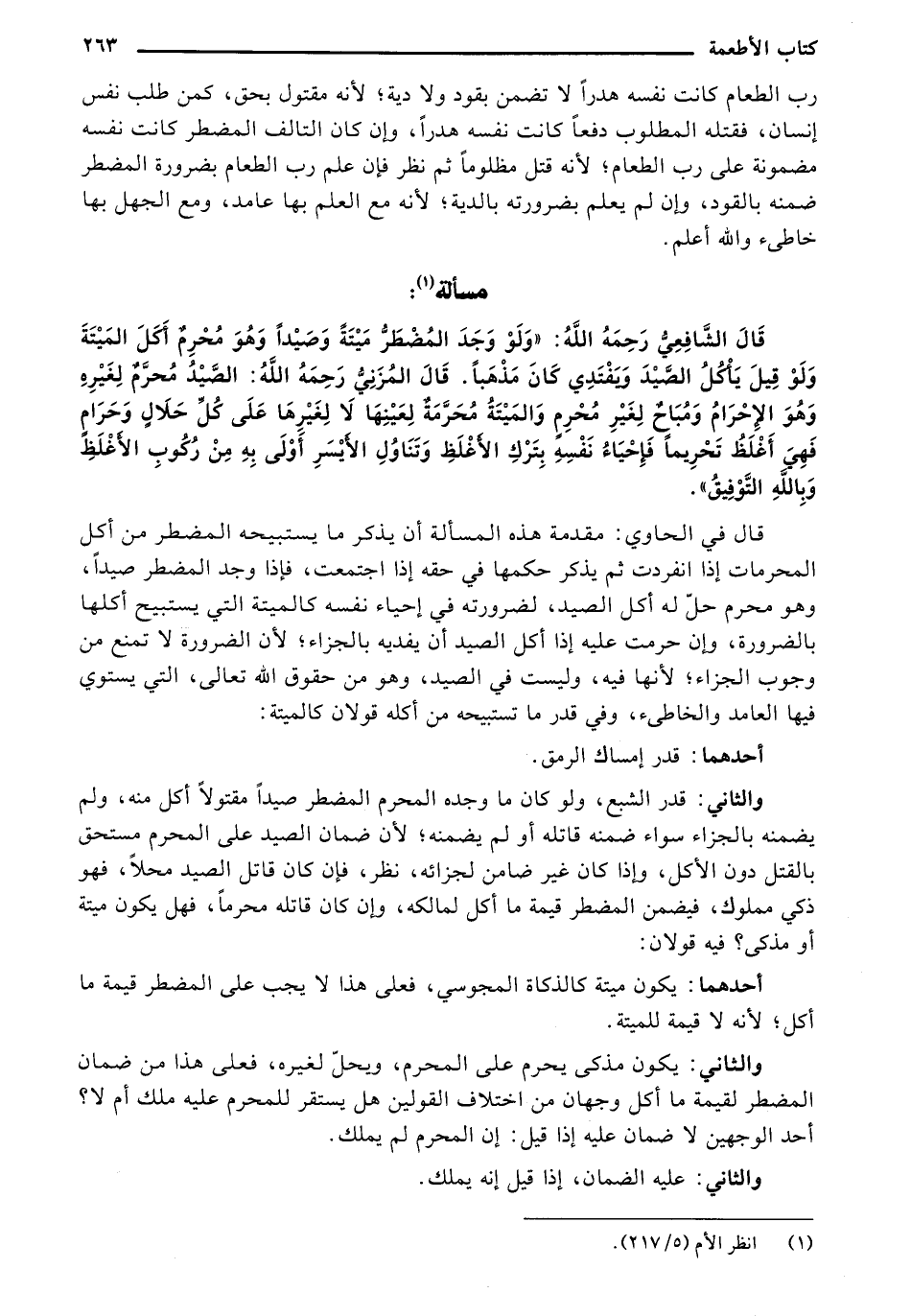 قال الشافعي رحمه الله: "ولو وجد المضطر ميتة وصيداً وهو محرم أكلل الميتة ولو قيل يأكل الصيد ويفتدي كان مذهباً. قال المزني رحمه الله: الصيد محرم لغيره وهو الإحرام ومباح لغير محرم والميتة محرمة لعينها لا لغيرها على كل حلال وحرام فهى أغلظ تحريماً فإحياء نفسه بترك الأغلظ وتناول الأيسر أولى به من ركوب الأغلظ بالله التوفيق ".