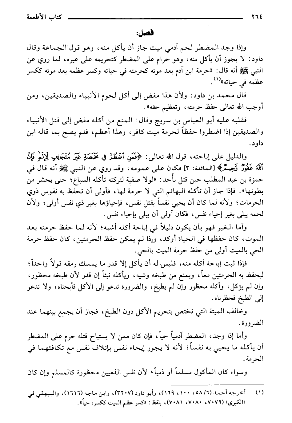 وإذا وجد المضطر لحم آدمي ميت جاز أن يأكل منه، وهو قول الجماعة وقال داود: لا يجوز أن يأكل منه، وهو حرام على المضطر كتحريمه على غيره، لما روي عن النبي - صلى الله عليه وسلم - أنه قال: "حرمة ابن آدم بعد موته كحرمته في حياته وكسر عظمه بعد موته ككسر عظمه في حياته ".
