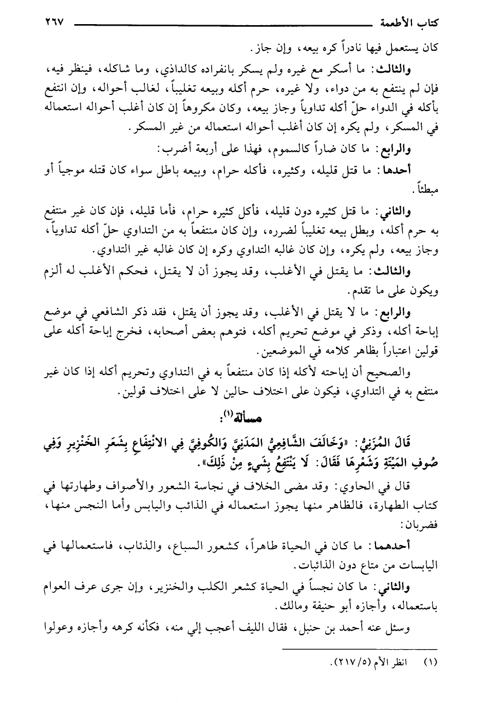 قال المزني: "وخالف الشافعي المزني والكوفي في الانتفاع بشعر الخنزير وفي صوف الميتة وشعرها فقال: لا ينتفع بشيء من ذلك".