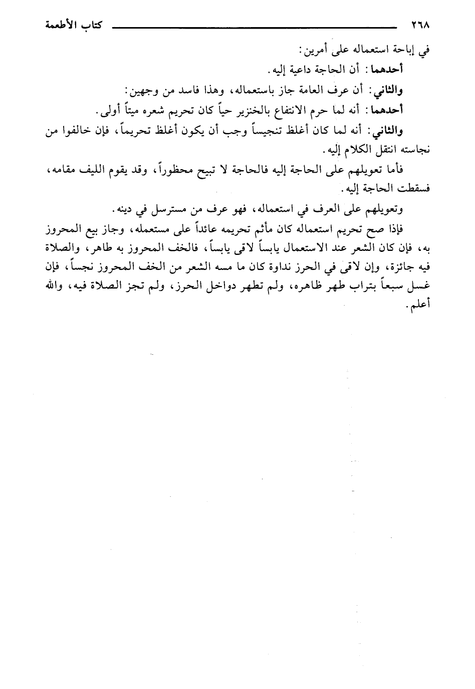 فإذا صح تحريم استعماله كان مأثم تحريمه عائداً على مستعمله، وجاز بيع المحروز به، فإن كان الشعر عند الاستعمال يابساً لاقى يابساً، فالخف المحروز به طاهر، والصلاة فيه جائزة، وإن لاقى في الحرز نداوة كان ما مسه الشعر من الخف المحروز نجساً، فإن غسل سبعاً بتراب طهر ظاهره، ولم تطهر دواخل الحرز، ولم تجز الصلاة فيه، والله أعلم.