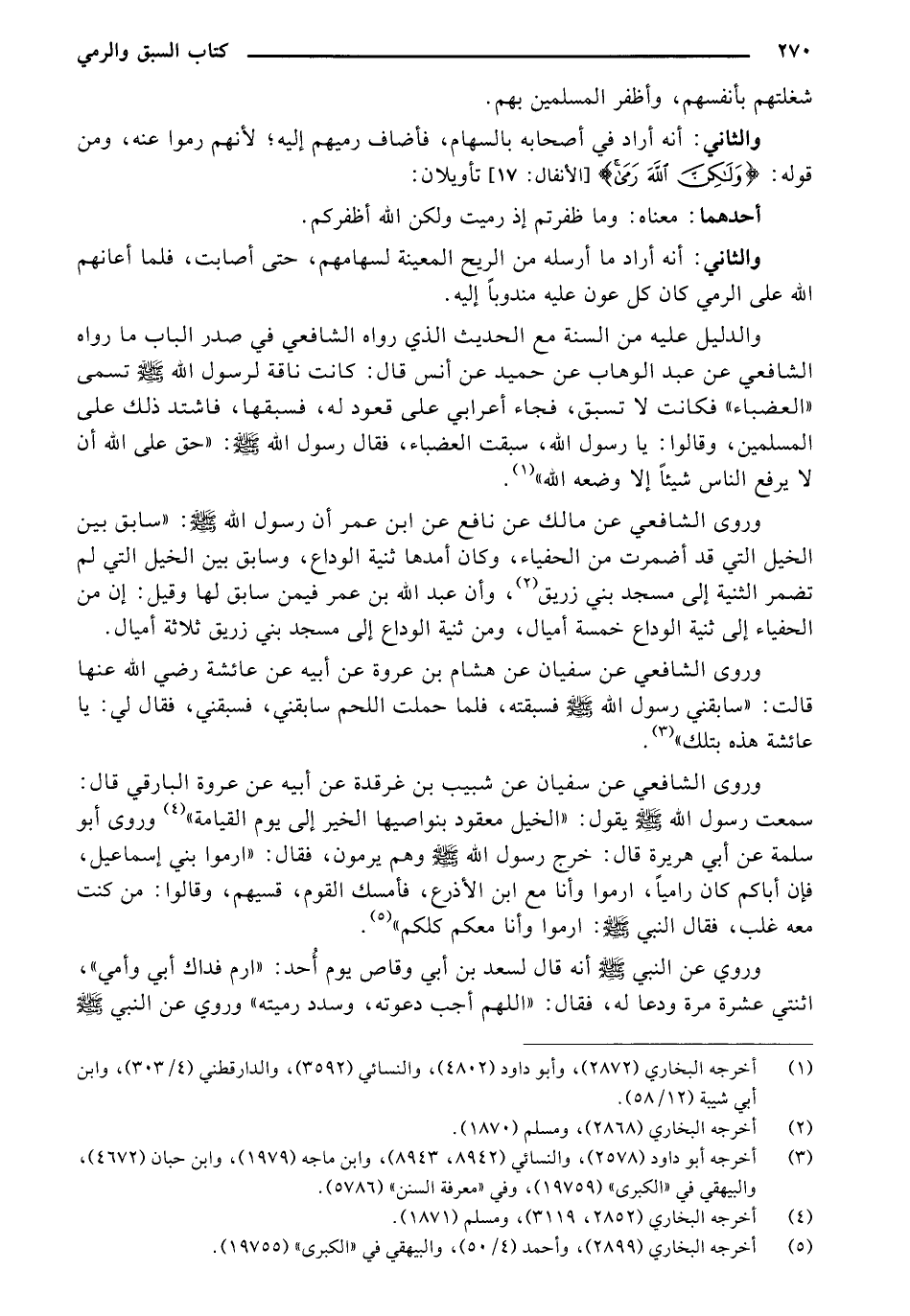 وروى الشافعي عن سفيان عن شبيب بن غرقدة عن أبيه عن عروة البارقي قال: سمعت وسول الله - صلى الله عليه وسلم - يقول: "الخيل معقود بنواصيها الخير إلى يوم القيامة " وروي أبو سلمة عن أبي هريرة قال: خرج رسول الله - صلى الله عليه وسلم - وهم يرمون، فقال: "ارموا بني إسماعيل، فإن أباكم كان رامياً، ارموا وأنا مع ابن الأذرع، فأمسك القوم، قسيهم، وقالوا: من كنت معه غلب، فقال النبي - صلى الله عليه وسلم -: ارموا وأنا معكم كلكم ".