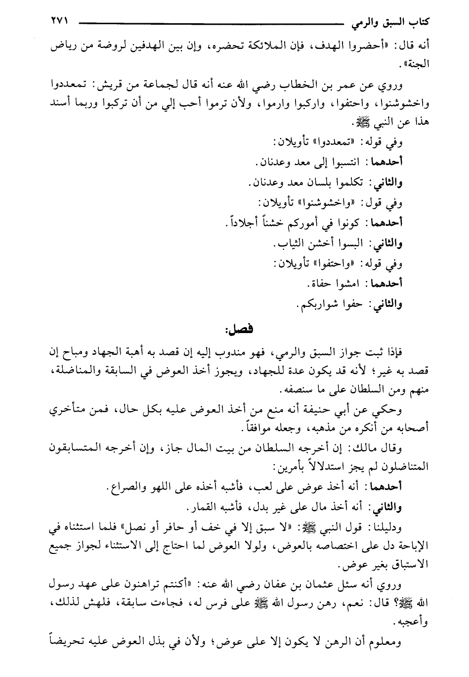 فإذا ثبت جواز السبق والرمي، فهو مندوب إليه إن قصد به أهبة الجهاد ومباح إن قصد به غير، لأنه يكون عدة للجهاد، ويجوز أخذ العوض في السابقة والمناضلة، منهم ومن السلطان على ما سنصفه.