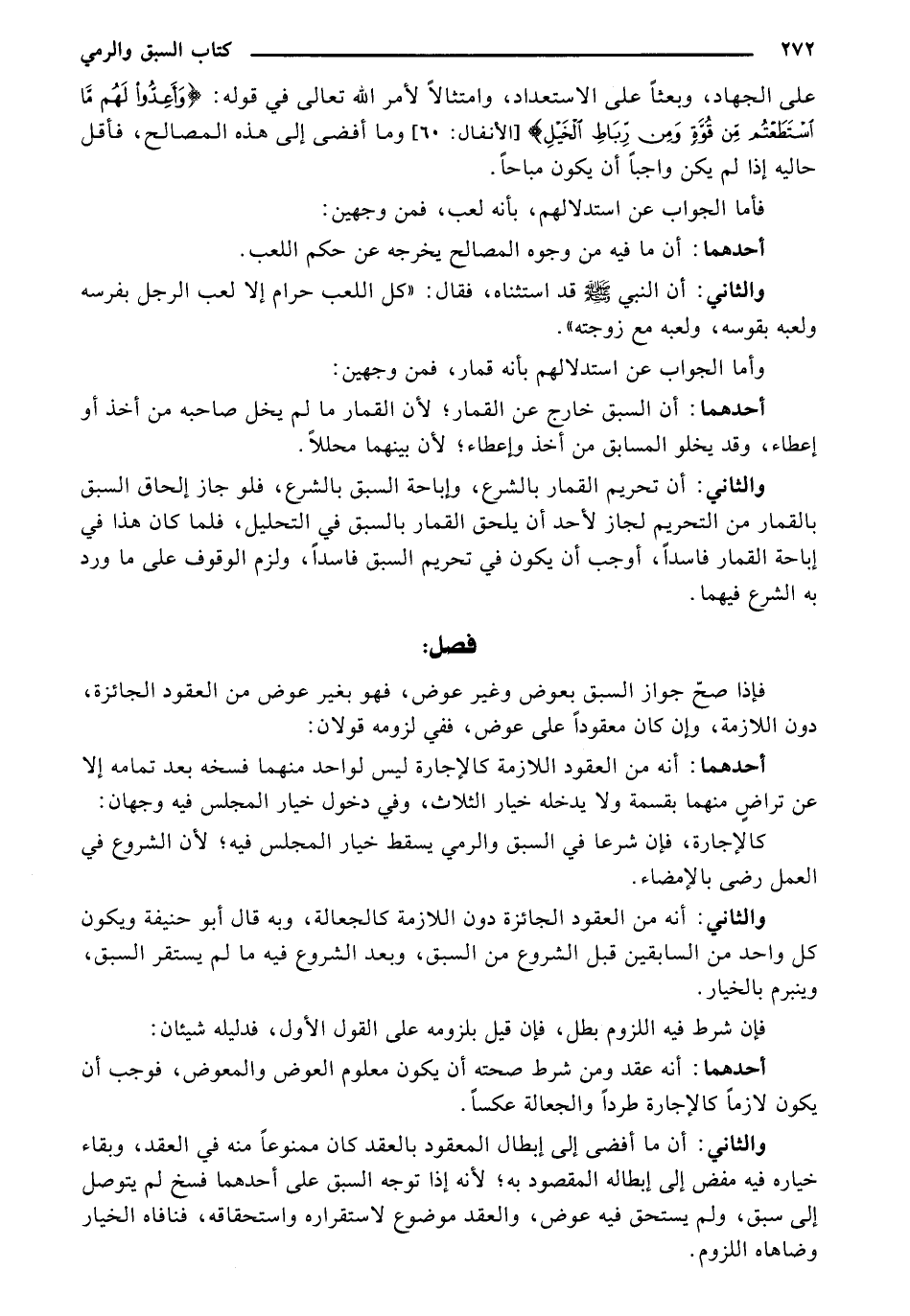والثاني: أن تحريم القمار بالشرع، وإباحة السبق بالشرع، فلو جاز إلحاق السبق بالقمار من التحريم لجاز لأحد أن يلحق القمار بالسبق في التحليل، فلما كان هذا في إباحة القمار فاسداً، أوجب أن يكون في تحريم السبق فاسداً، ولزم الوقوف على ما ورد به الشرع فيهما.