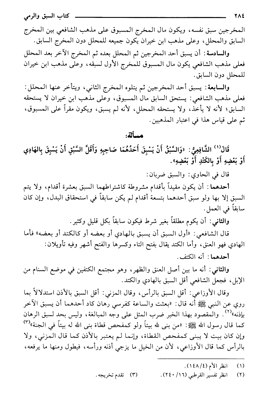 قال الشافعي: "والسبق أن يسبق أحدهما صاحبه وأقل السبق أن يسبق بالهادي أؤ بعضه أو بالكتد أو بعضه"