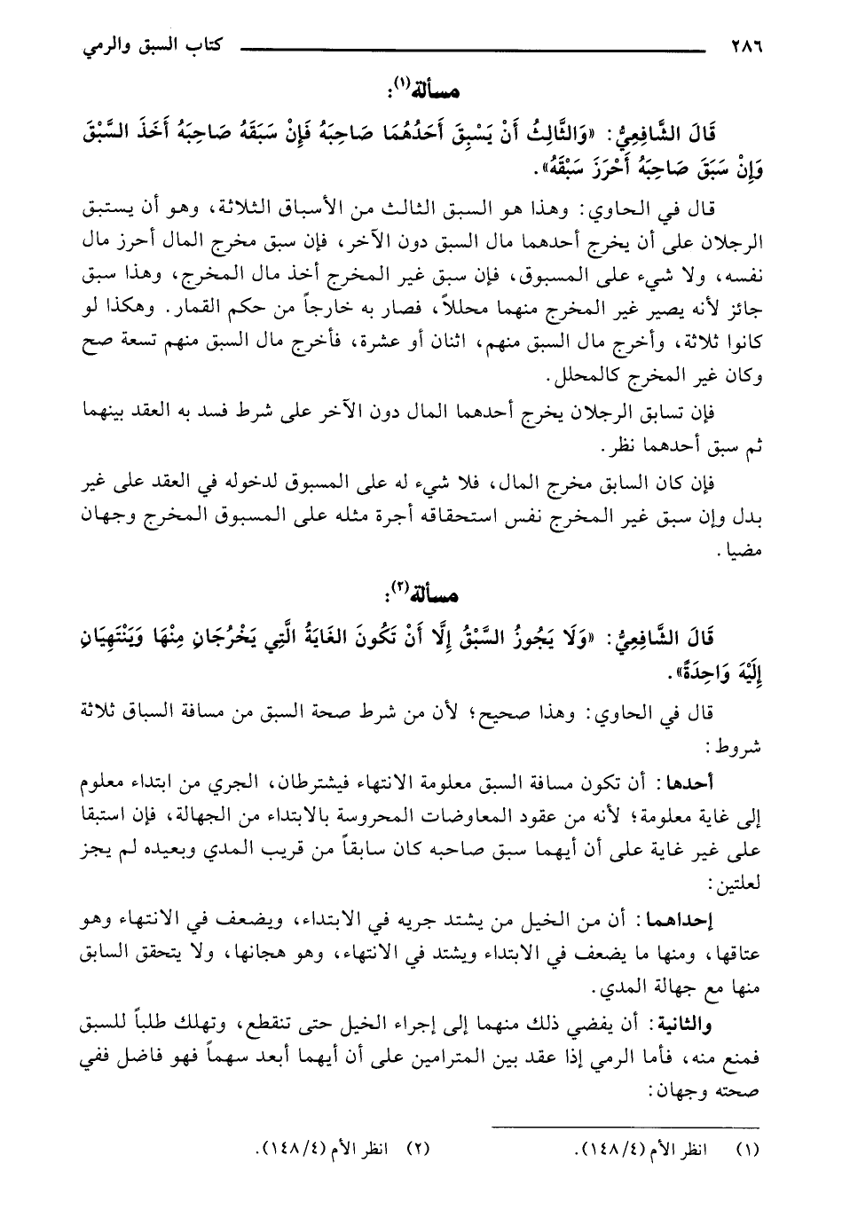 قال الشافعي: "والثالث أن يسبق أحدهما صاحبه فان سبقه صاحبه أحذ السبق وإن سبق صاحبه أحرز سبقه".