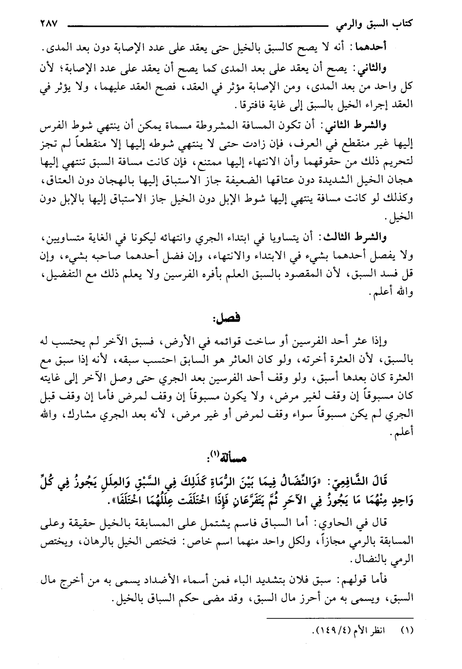 قال الشافعي: "والنضال فيما بين الرماة كذلك في السبق والعلل يجوز في كل واحد منهما ما يجوز في الآخر ثم يتفرعان فإذا اختلفت عللهما اختلفا".