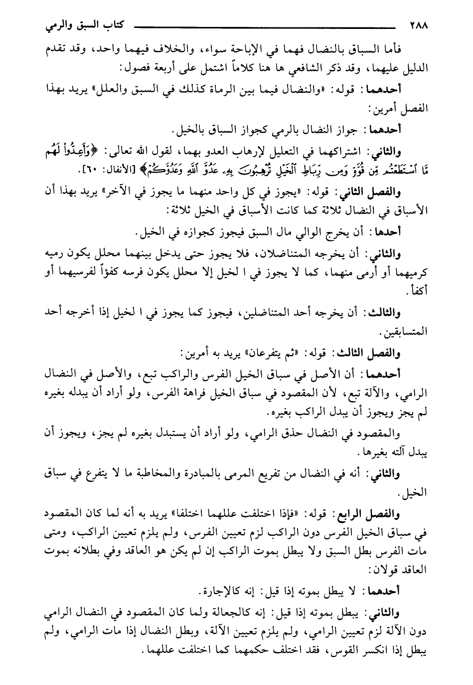 أحدهما: قوله: "والنضال فيما بين الرماة كذلك في السبق والعلل" يريد بهذا الفصل أمرين: