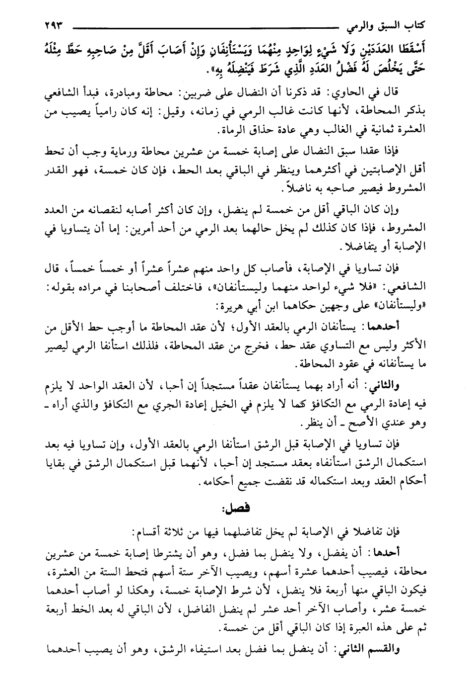 أحدها: أن يفضل، ولا ينضل بما فضل، وهو أن يشترطا إصابة خمسة من عشرين محاطة، فيصيب أحدهما عشرة أسهم، ويصيب الآخر ستة أسهم فتحط الستة من العشرة، فيكون الباقي منها أربعة فلا ينضل، لأن شرط الإصابة خمسة، وهكذا لو أصاب أحدهما خمسة عشر، وأصاب الآخر أحد عشر لم ينضل الفاضل، لأن الباقي له بعد الخط أربعة ثم على هذه العبرة إذا كان الباقي أقل من خمسة.