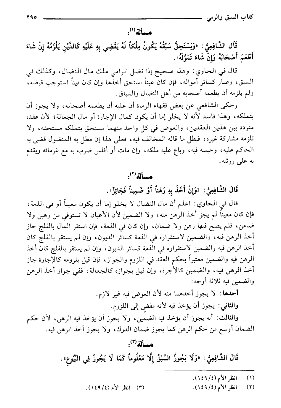 قال في الحاوي: أعلم أن مال النضال لا يخلو إما أن يكون معينا أو في الذمة، فإن كان معينا لم يجز أخذ الرهن منه، ولا الضمين لأن الأعيان لا تستوفي من رهين ولا ضامن، فلم يصح فيها رهن ولا ضمان، وإن كان في الذمة، فإن استقر المال بالفلج جاز أخذ الرهن فيه، والضمين لاستقراره في الذمة كسائر الديون، وان لم يستقر بالفلج كان أخذ الرهن فيه والضمين لاستقراره في الذمة كسائر الديون، وان لم يستقر بالفلج كان أخذ الرهن فيه والضمين معتبرا بحكم العقد في اللزوم والجواز، فإن قيل بلزومه كالإجارة جاز أخذ الرهن فيه، والضمين كالأجرة، وإن قيل بجوازه كالجعالة، ففي جواز أخذ الرهن والضمين فيه ثلاثة أوجه: