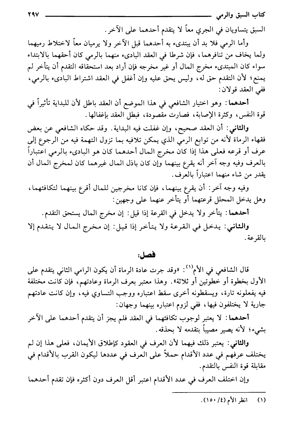 وأما الرمي فلا بد أن يبتدئ به أحدهما قبل الآخر ولا يرميان معاً لاختلاط رميهما ولما يخاف من تنافرهما، فإن شرطا في العقد البادئ، منهما بالرمي كان أحقهما بالابتداء سواء كان المبتدئ مخرج المال أو غير مخرجه فمان أراد بعد استحقاقه التقدم أن يتأخر لم يمنع؛ لأن التقدم حق له، وليس يحق عليه وان أغفل في العقد اشتراط البادئ بالرمي، ففي العقد قولان: