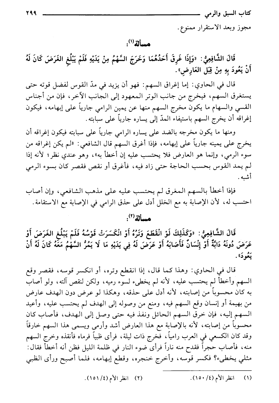 ومنها ما يكون مخرجه بالضد على يساره الرامي جارياً على سبابته فيكون إغراقه أن يخرج على يمينه جارياً على إبهامه، فإذا أغرق السهم قال الشافعي: "لم يكن إغراقه من سوء الرمي، وإنما هو العارض فلا يحتسب عليه إن أخطأ به "، وهو عندي نظر؛ لأنه إذا لم يمد القوس بحسب الحاجة حتى زاد فيه، فأغرق أو نقص فقصر كان بسوء الرمي أشبه.