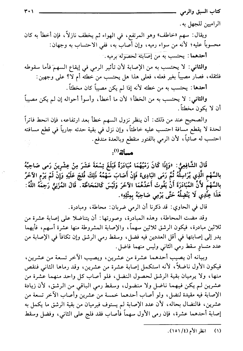 قال الشافعي: "وإذا كان رميهما مبادرة فبلغ تسعة عشر من عشرين رمى صاحبه بالسهم الذي يراسله ثم رمى البادئ فإن أصاب سهمه ذلك فلج عليه وإن لم يرم الآخر بالسهم لأن المبادرة أن يفوت أحدهما الآخر وليس كالمحاطة. قال المزني رحمه الله: هذا عندي لا ينضله حتى يرمي صاحبه بمثله".