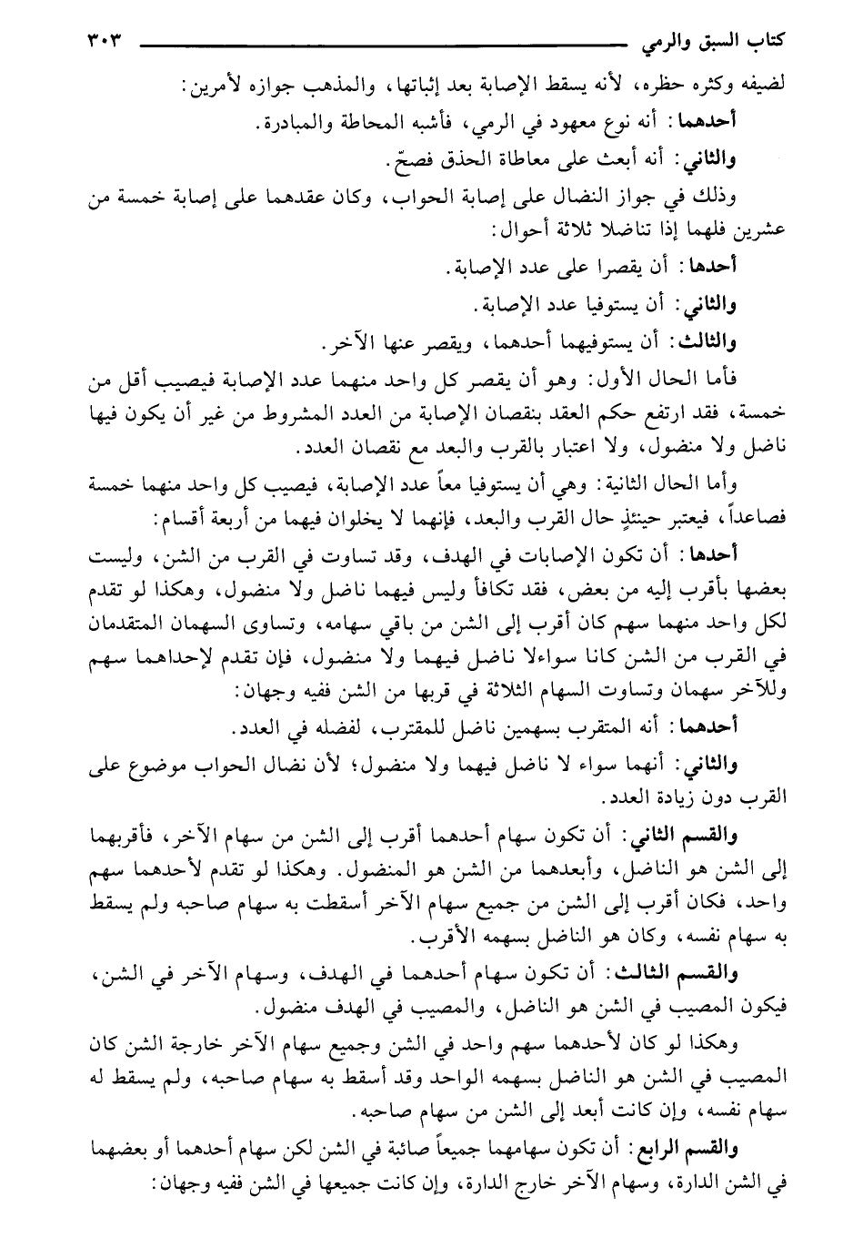 والقسم الرابع: أن تكون سهامهما جميعاً صائبة في الشن لكن سهام أحدهما أو بعضهما في الشن الدارة، وسهام الآخر خارج الدارة، وان كانت جميعها في الشن ففيه وجهان:
