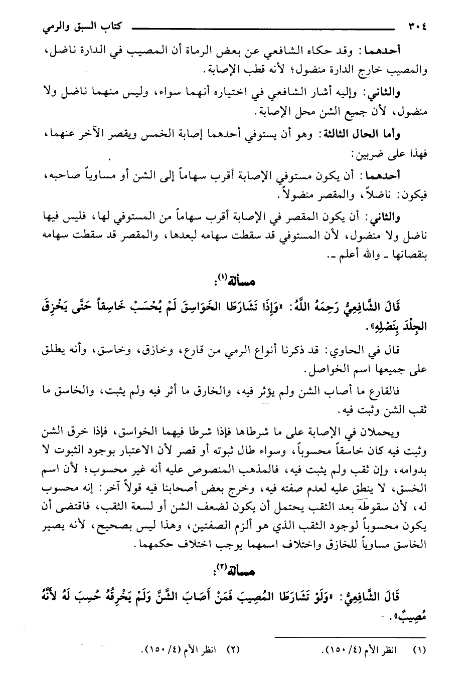 والثاني: أن يكون المقصر في الإصابة أقرب سهاماً من المستوفي لها، فليس فيها ناضل ولا منضول، لأن المستوفي قد سقطت سهامه لبعدها، والمقصر قد سقطت سهامه بنقصانها - والله أعلم _.