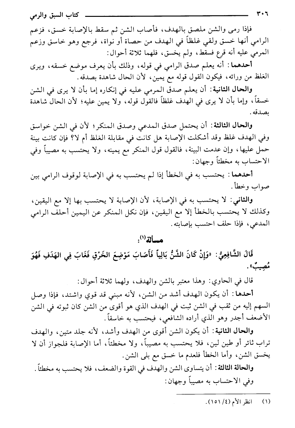 والحال الثالثه: أن يحتمل صدق المدعي وصدق المنكر؛ لأن في الشن خواسق وفي الهدف غلظ وقد أشكلت الإصابة هل كانت في مقابلة الغلظ أم لا؟ فإن كانت بينة حمل عليها، وان عدمت البينة، فالقول قول المنكر مع يمينه، ولا يحتسب به مصيباً وفي الاحتساب به مخطئاً وجهان: