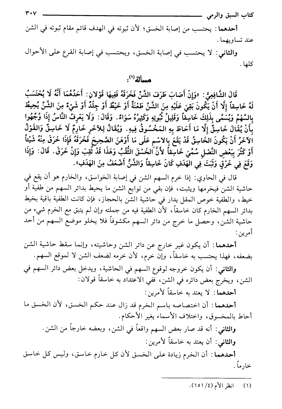 قال الشافعي: "وإن أصاب طرفه الشن فخرقه ففيها قولان: أحدهما أنه لا يحتسب له خاسقاً إلا أن يكون بقى عليه من الشن طعنه أو خيط أو جلد أو شيء من الشن يحيط بالسهم ويسمى بذلك خاسقاً ´وقليل ثبوته وكثيره سواء. وقال: ولا يعرف الناس إذا وجهوا بأن يقال خاسق إلا ما أحاط به المخسوق فيه. ويقال للآخر خارم لا خاسق والقول الآخر أن يكون الخاسق قد يقع بالإسم على ما أوهن الصحيح فخرقه فإذا خرق منه شيئاً أو كثر ببعض النصل سمي خاسقاً لأن الخسق الثقب وهذا قد ثقب وإن خرق. قال: وإذا وقع في خرق وثبت في الهدف كان خاسقاً والشن أضعف من الهدف".