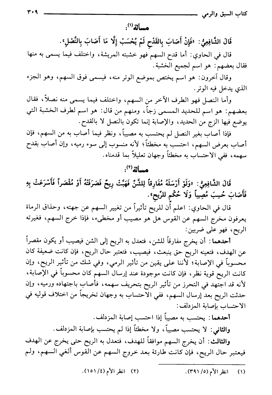 أحدهما: أن يخرج مفارقاً للشن، فتعدل به الريح إلى الشن فيصيب أو يكون مقصراً عن الهدف، فتعينه الريح حق ينبعث، فيصيب، فتعتبر حال الريح، فإن كانت ضعيفة كان محسوباً في الإصابة؛ لأننا على يقين من تأثير الرمي، وفي شك من تأثير الريح، وإن كانت الريح قوية نظر، فإن كانت موجودة عند إرسال السهم كان محسوباً في الإصابة، لأنه قد اجتهد في التحرز من تأثير الريح بتحريف سهمه، فأصاب باجتهاده ورميه، وان حدثت الريح بعد إرسال السهم، ففي الاحتساب به وجهان تخريجاً من اختلاف قوليه في الاحتساب بإصابة المزدلف: