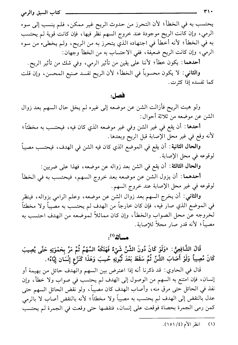 والثاني: أن يخرج السهم بعد زوال الشن عن موضعه، وعلم الرامي بزواله، فينظر في الموضع الذي صار فيه، فإن كان خارجاً من الهدف لم يحتسب به مصيباً ولا مخطئاً لخروجه عن محل الصواب والخطأ، وإن كان مماثلاً لموضعه من الهدف احتسب به مصيباً لأنه قدر صار محلاً للإصابة.