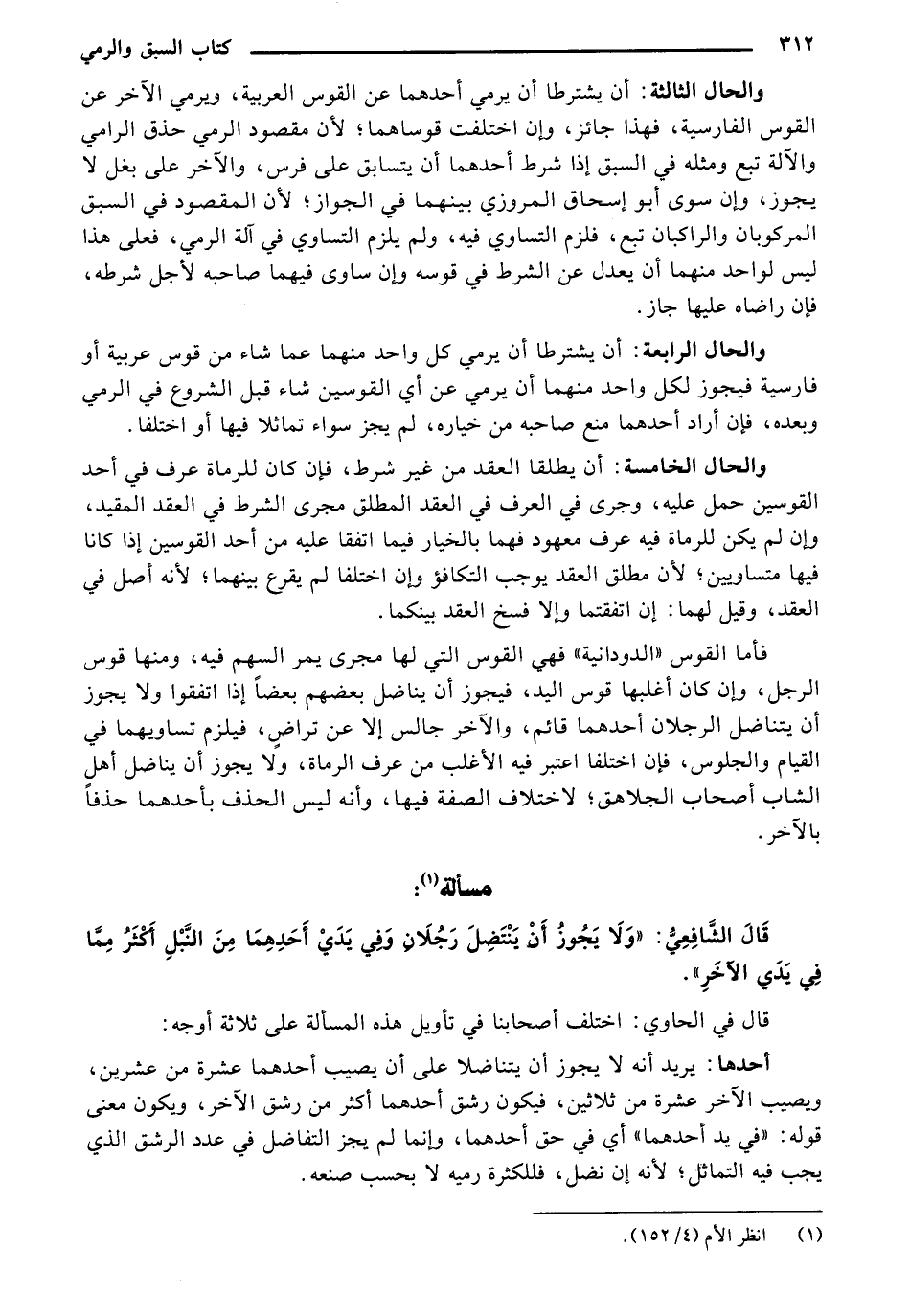 والحال الرابعة: أن يشترطا أن يرمي كل واحد منهما عما شاء من قوس عربية أو فارسية فيجوز لكل واحد منهما أن يرمي عن أي القوسين شاء قبل الشروع في الرمي وبعده، فإن أراد أحدهما منع صاحبه من خياره، لم يجز سواء تماثلا فيها أو اختلفا.