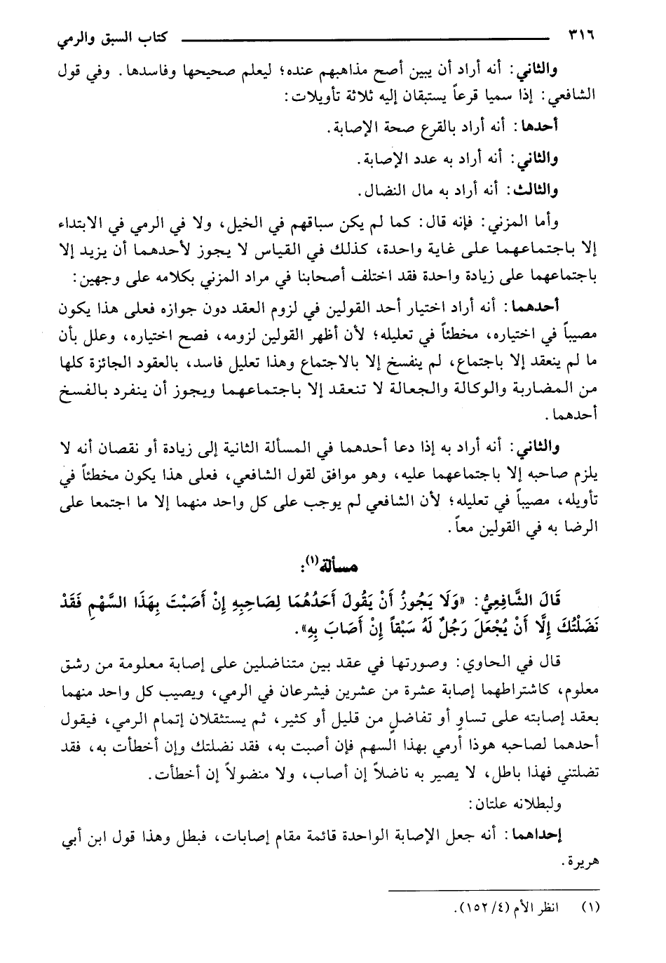 وأما المزني: فإنه قال: كما لم يكن سباقهم في الخيل، ولا في الرمي في الابتداء إلا باجتماعهما على غاية واحدة، كذلك في القياس لا يجوز لأحدهما أن يزيد إلا باجتماعهما على زيادة واحدة فقد اختلف أصحابنا في مراد المزني بكلامه على وجهين: