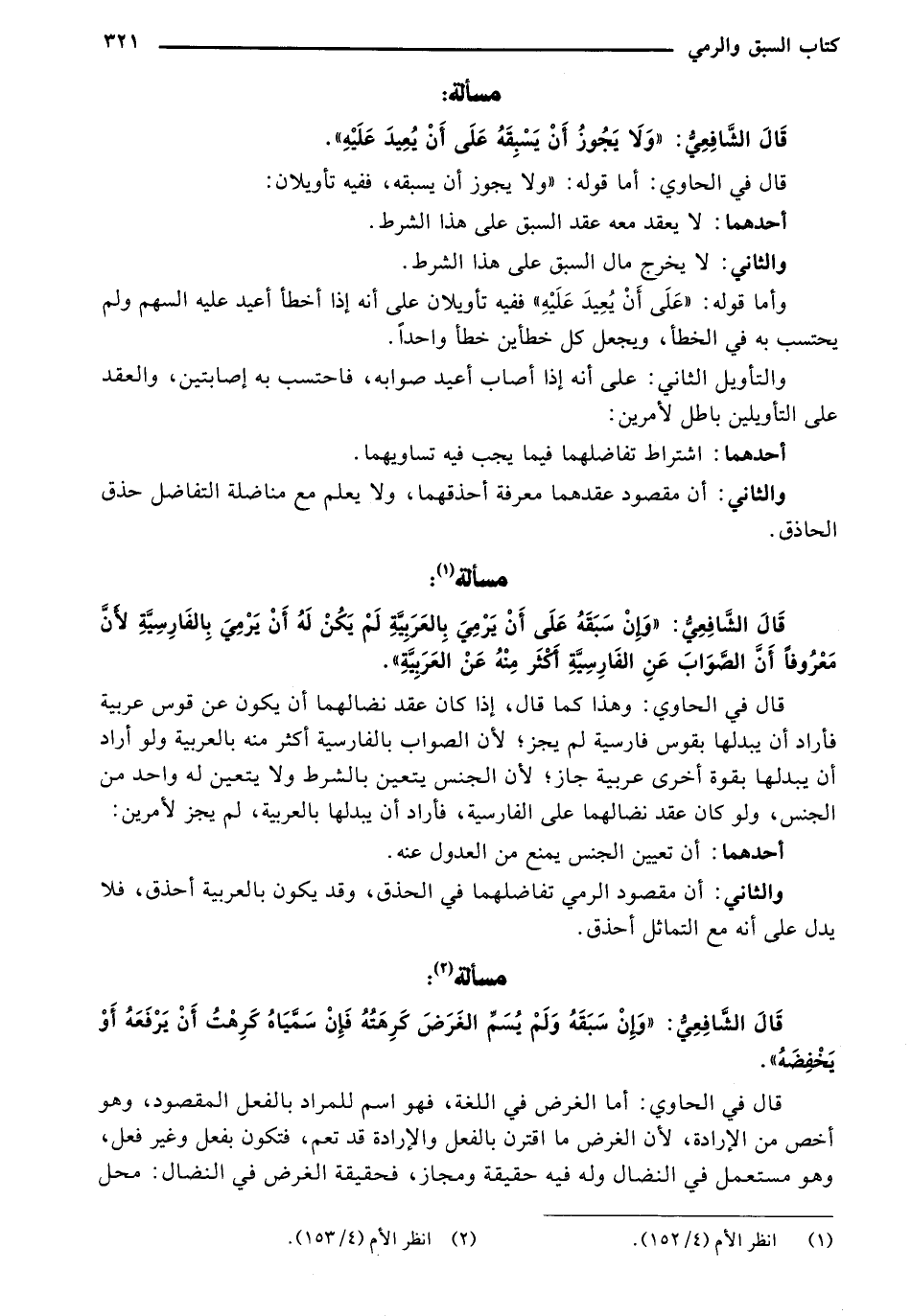 قال الشافعي:"وإن سبقه على أن يرمي بالعربية لم يكن له أن يرمي بالفارسية لأن معروفاً أن الصواب عن الفارسية أكثر منه عن العربية".