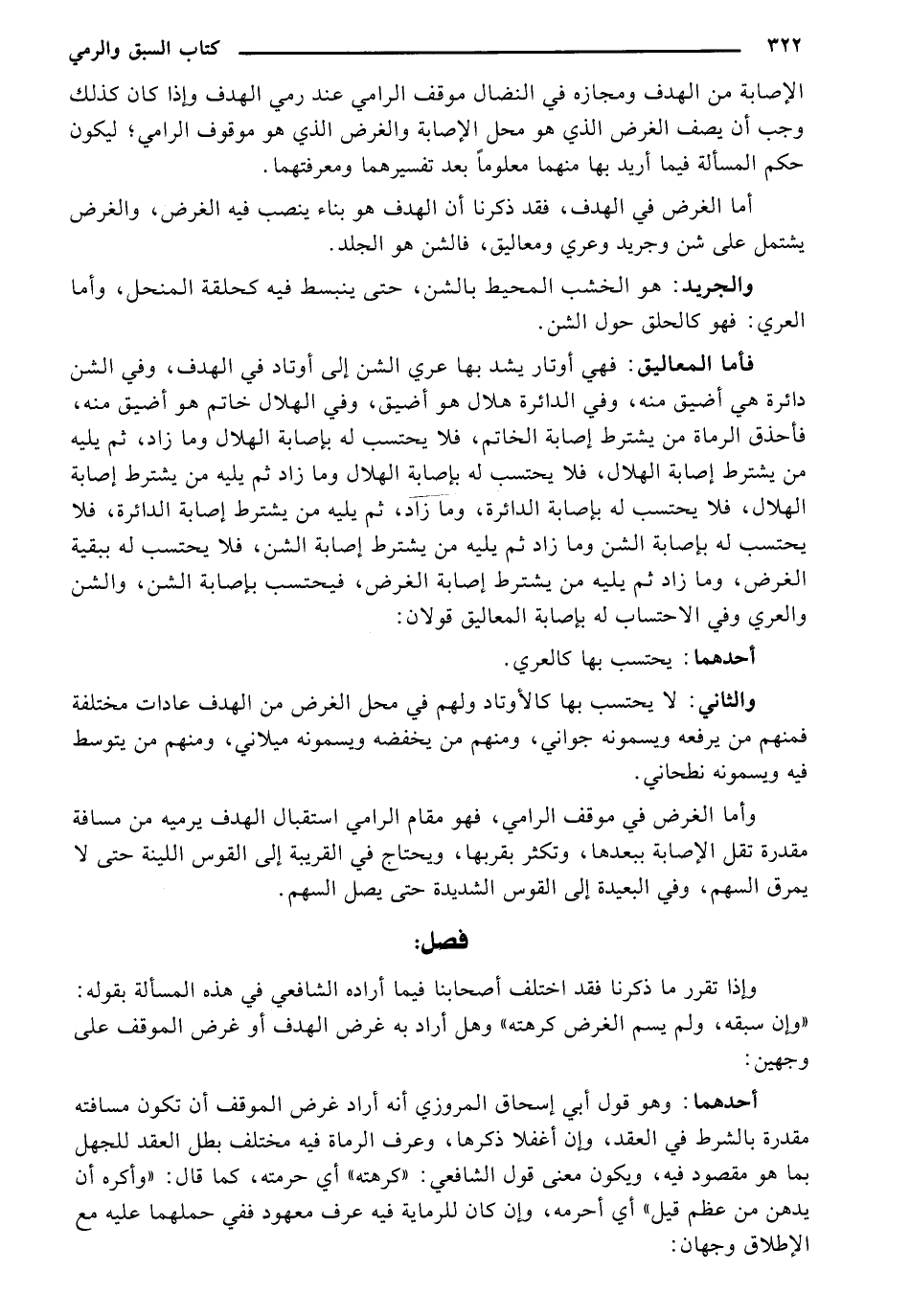 الإصابة من الهدف ومجازه في النضال موقف الرامي عند رمي الهدف وإذا كان كذلك وجب أن يصف الغرض الذي هو محل الإصابة والغرض الذي هو موقوف الرامي؛ ليكون حكم المسألة فيما أريد بها منهما معلوماً بعد تفسيرهما ومعرفتهما.
