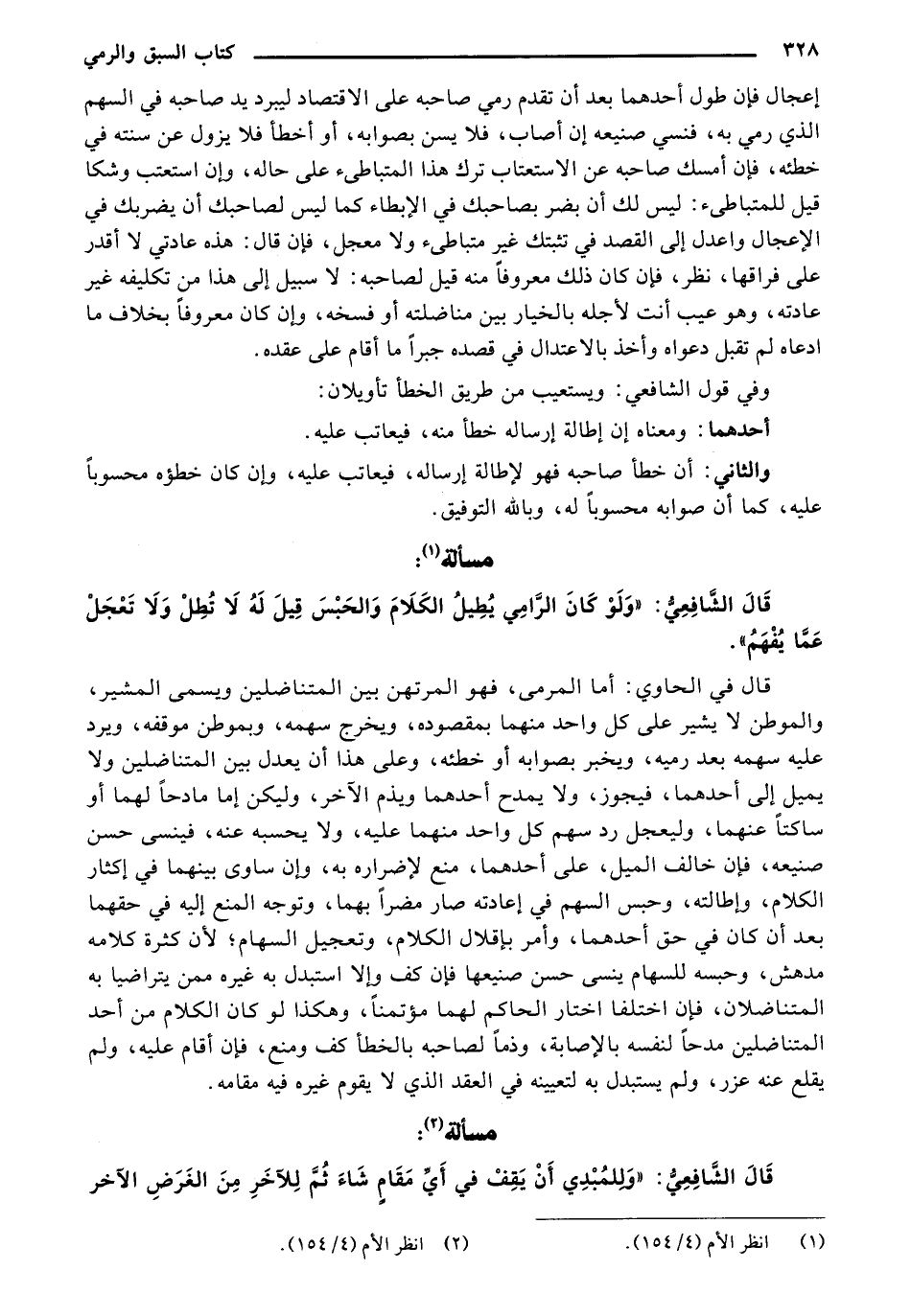 إعجال فإن طول أحدهما بعد أن تقدم رمي صاحبه على الاقتصاد ليبرد يد صاحبه في السهم الذي رمي به، فنسي صنيعه إن أصاب، فلا يسن بصوابه، أو أخطأ فلا يزول عن سنته في خطئه، فإن أمسك صاحبه عن الاستعتاب ترك هذا المتباطئ على حاله، وإن استعتب وشكا قيل للمتباطئ: ليس لك أن بضر بصاحبك في الإبطاء كما ليس لصاحبك أن يضربك في الإعجال واعدل إلى القصد في تثبتك غير متباطئ ولا معجل، فإن قال: هذه عادتي لا أقدر على فراقها، نظر، فإن كان ذلك معروفاً منه قيل لصاحبه: لا سبيل إلى هذا من تكليفه غير عادته، وهو عيب أنت لأجله بالخيار بين مناضلته أو فسخه، وإن كان معروفاً بخلاف ما ادعاه لم تقبل دعواه وأخذ بالاعتدال في قصده جبراً ما أقام على عقده.