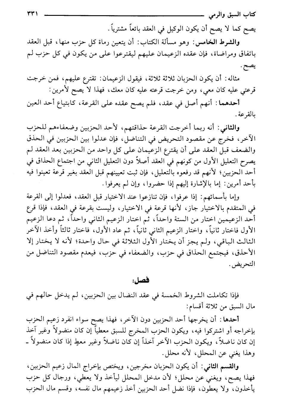 فإذا تكاملت الشروط الخمسة في عقد النضال بين الحزبين، لم يدخل حالهم في مال السبق من ثلاثة أقسام: