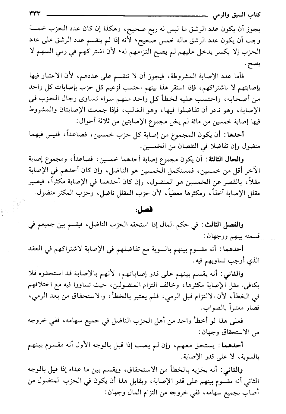فأما عدد الإصابة المشروطة، فيجوز أن لا تنقسم على عددهم، لأن الاعتبار في بإصابتهم لا باشتراكهم، فإذا استقر هذا بينهم احتسب لزعيم كل حزب بإصابات كل واحد من أصحابه، واحتسب عليه لخطأ كل واحد منهم سواء تساوى رجال الحزب في الإصابة، وهو نادر أن تفاضلوا فيها، وهو الغالب، فإذا جمعت الإصابتان والمشروط فيها إصابة خمسين من مائة لم يخل مجموع الإصابتين من ثلاثة أحوال: