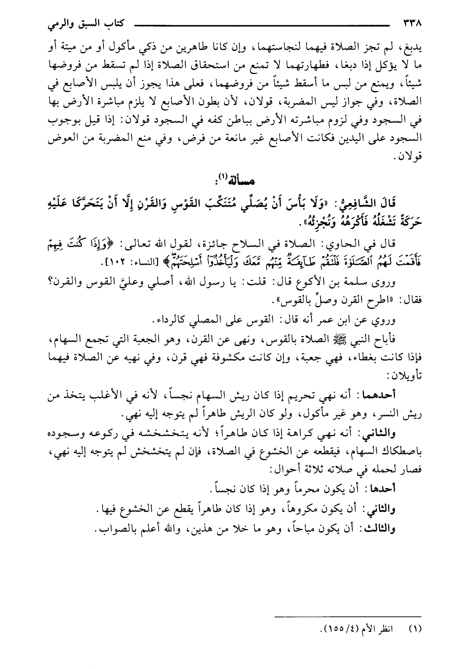 قال الشافعي: "ولا بأس أن يصلي متنكب القوس والقرن إلا أن يتحركا عليه حركة تشغله فأكرهه وتجزئه ".