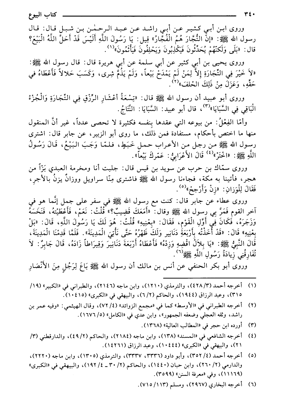 وروى يحيى بن أبي كثير عن أبي سلمة عن أبي هريرة قال: قال رسول الله - صلى الله عليه وسلم -: "لا خير في التجارة إلا لمن لم يمدح بيعاً، ولم يذم شرى، وكسب حلالاً فأعطاه في حقه، وعزل من ذلك الحلف"