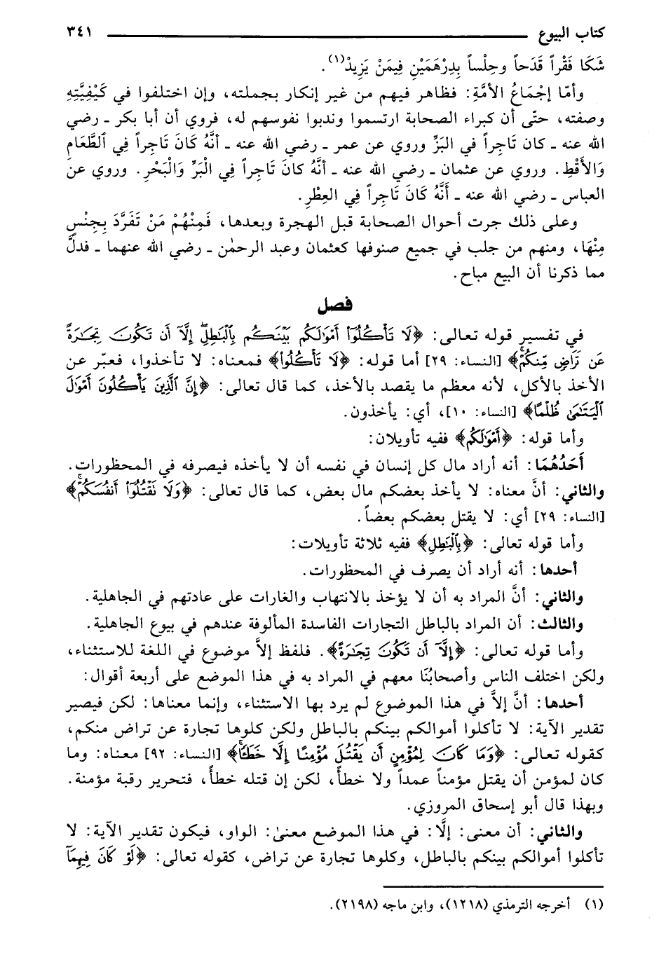 في تفسير قوله تعالى: {يَا أَيُّهَا الَّذِينَ آمَنُوا لاَ تَاكُلُوا أَمْوَالَكُمْ بَيْنَكُمْ بِالْبَاطِلِ إِلاَّ أَن تَكُونَ تِجَارَةً عَن تَرَاضٍ مِّنكُمْ} [النساء: 29] أما قوله: {لاَ تَاكُلُوا} فمعناه: لا تأخذوا، فعبر عن الأخذ بالأكل، لأنه معظم ما يقصد بالأخذ، كما قال تعالى: {إِنَّ الَّذِينَ يَاكُلُونَ أَمْوَالَ الْيَتَامَى ظُلْماً} [النساء: 10]، أي: يأخذون.