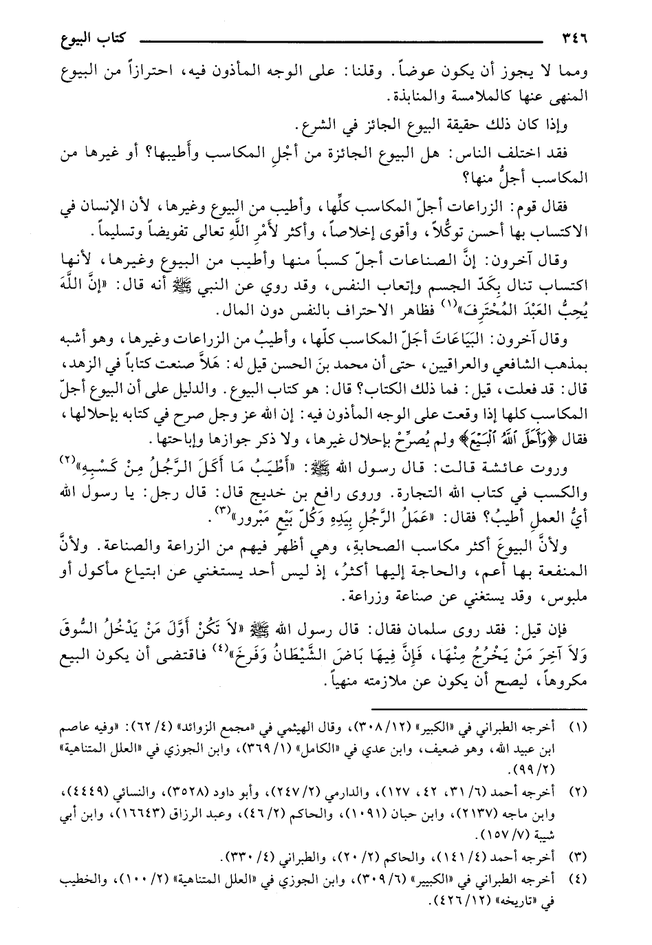 وقال آخرون: البياعات أجَل المكاسب كلها، وأطيبُ من الزراعات وغيرها، وهو أشبه بمذهب الشافعي والعراقيين، حتى أن محمد بن الحسن قيل له: هلاَّ صنعت كتاباً في الزهد، قال: قد فعلت، قيل: فما ذلك الكتاب؟ قال: هو كتاب البيوع. والدليل على أن البيوع أجل المكاسب كلها إذا وقعت على الوجه المأذون فيه: إن الله عز وجل صرح في كتابه بإحلالها، فقال {أَحَلَّ اللهُ الْبَيْعَ} ولم يصرح بإحلال غيرها، ولا ذكر جوازها وإباحتها.