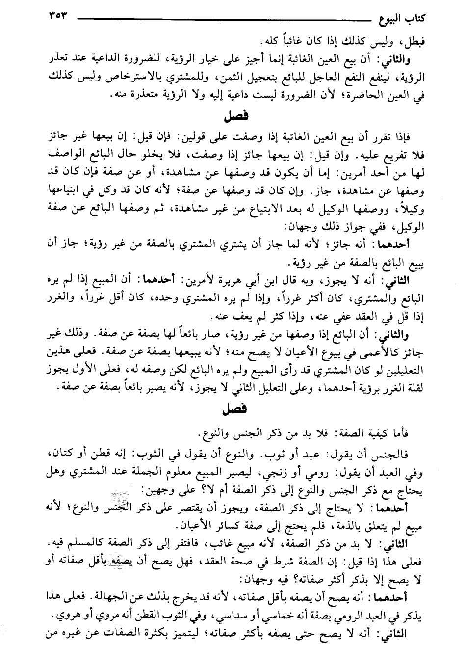 والثاني: أن البائع إذا وصفها من غير رؤية، صار بائعاً لها بصفة عن صفة. وذلك غير جائز كالأعمى في بيوع الأعيان لا يصح منه؛ لأنه يبيعها بصفة عن صفة. فعلى هذين التعليلين لو كان المشتري قد رأى المبيع ولم يره البائع لكن وصفه له، فعلى الأول يجوز لقلة الغرر برؤية أحدهما، وعلى التعليل الثاني لا يجوز، لأنه يصير بائعاً بصفة عن صفة.