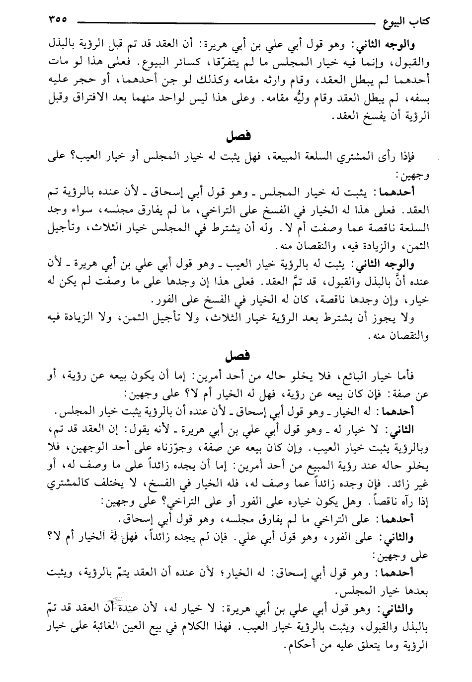 والوجه الثاني: وهو قول أبي علي بن أبي هريرة: أن العقد قد تم قبل الرؤية بالبذل والقبول، وإنما فيه خيار المجلس ما لم يتفرقا، كسائر البيوع. فعلى هذا لو مات أحدهما لم يبطل العقد، وقام وارثه مقامه وكذلك لو جن أحدهما، أو حجر عليه بسفه، لم يبطل العقد وقام وليه مقامه. وعلى هذا ليس لواحد منهما بعد الافتراق وقبل الرؤية أن يفسخ العقد.
