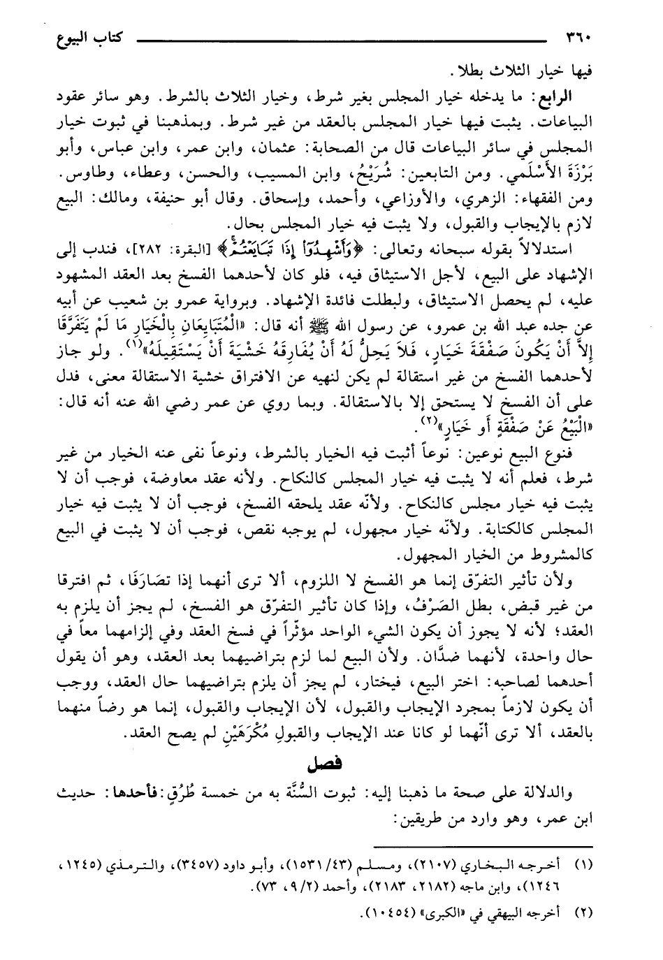 فنوع البيع نوعين: نوعاً أثبت فيه الخيار بالشرط، ونوعاً نفى عنه الخيار من غير شرط، فعلم أنه لا يثبت فيه خيار المجلس كالنكاح. ولأنه عقد معاوضة، فوجب أن لا يثبت فيه خيار مجلس كالنكاح. ولأنه عقد يلحقه الفخ، فوجب أن لا يثبت فيه خيار المجلس كالكتابة. ولأنه خيار مجهول، لم يوجبه نقص، فوجب أن لا يثبت في البيع كالمشروط من الخيار المجهول.