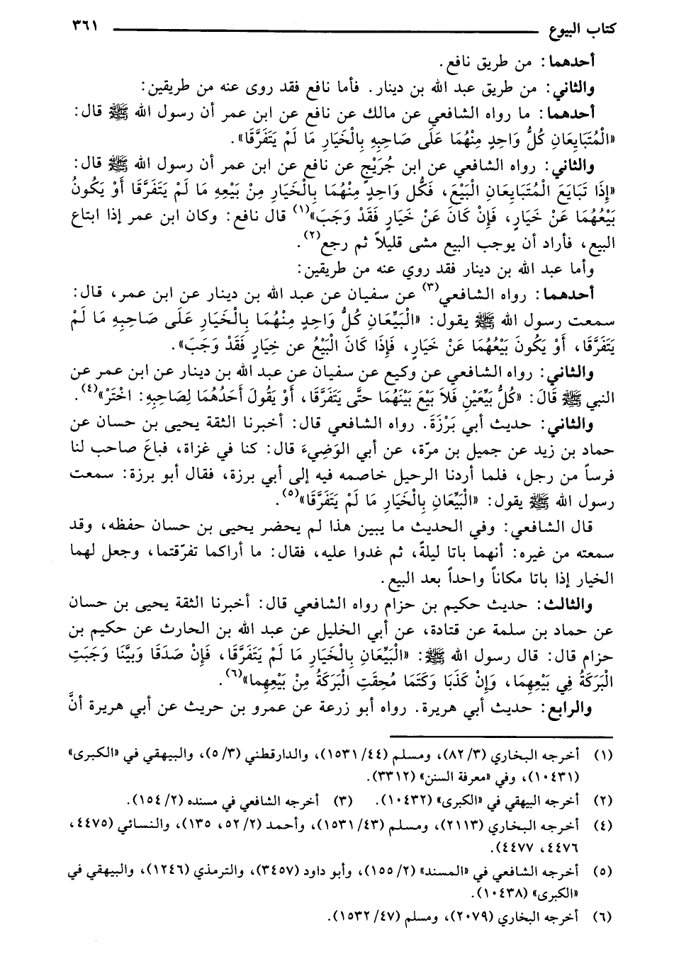 والثاني: رواه الشافعي عن وكيع عن سفيان عن عبد الله بن دينار عن ابن عمر عن النبي - صلى الله عليه وسلم - قال: "كل بيعين فلا بيع بينهما حتى يتفرقا، أو يقول احدهما لصاحبه: اختر".