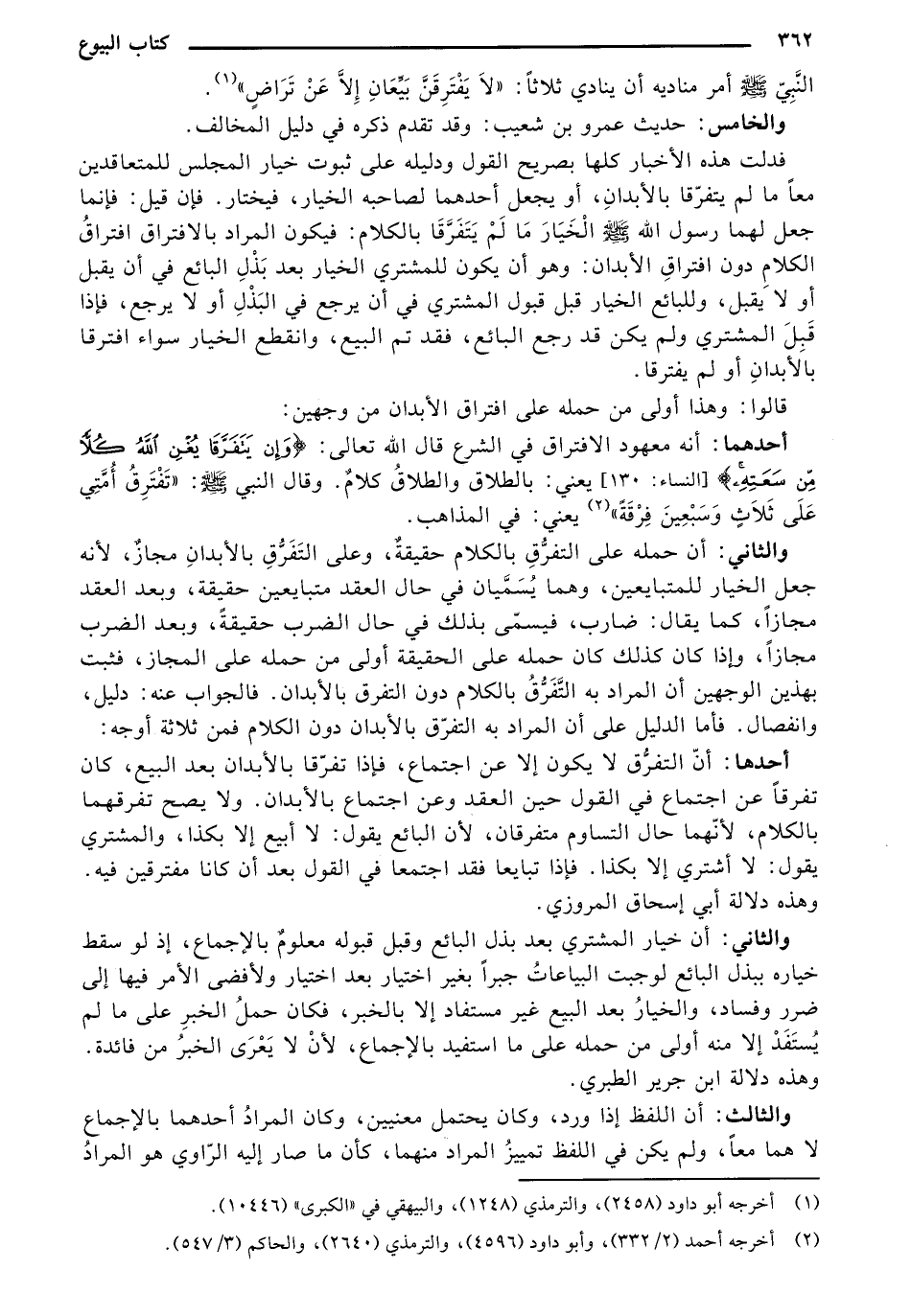 فدلت هذه الأخبار كلها بصريح القول ودليله على ثبوت خيار المجلس للمتعاقدين معاً ما لم يتفرقا بالأبدان، أو يجعل أحدهما لصاحبه الخيار، فيختار. فإن قيل: فإنما جعل لهما رسول الله - صلى الله عليه وسلم - الخيار ما لم يتفرقا بالكلام: فيكون المراد بالافتراق افتراق الكلام دون افتراق الأبدان: وهو أن يكون للمشتري الخيار بعد بذل البائع في أن يقبل أو لا يقبل، وللبائع الخيار قبل قبول المشتري في أن يرجع في البذل أو لا يرجع، فإذا قل المشتري ولم يكن قد رجع البائع، فقد تم البيع، وانقطع الخيار سواء افترقا بالأبدان أو لم يفترقا.