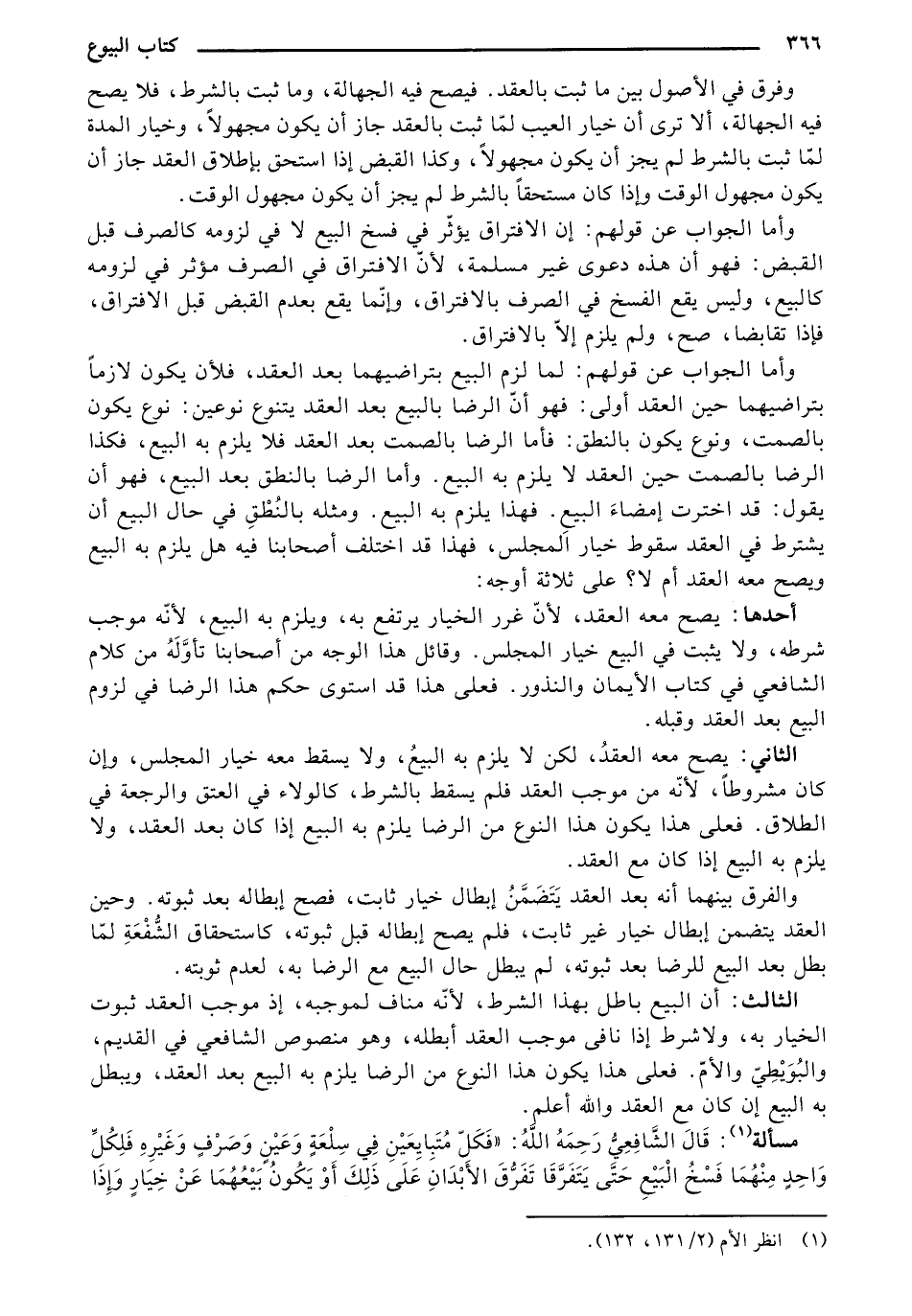 وأما الجواب عن قولهم: إن الافتراق يؤثر في فسخ البيع لا في لزومه كالصرف قبل القبض: فهو أن هذه دعوى غير مسلمة، لأن الافتراق في الصرف مؤثر في لزومه كالبيع، وليس يقع الفسخ في الصرف بالافتراق، وإنما يقع بعدم القبض قبل الافتراق، فإذا تقابضا، صح، ولم يلزم إلا بالافتراق.