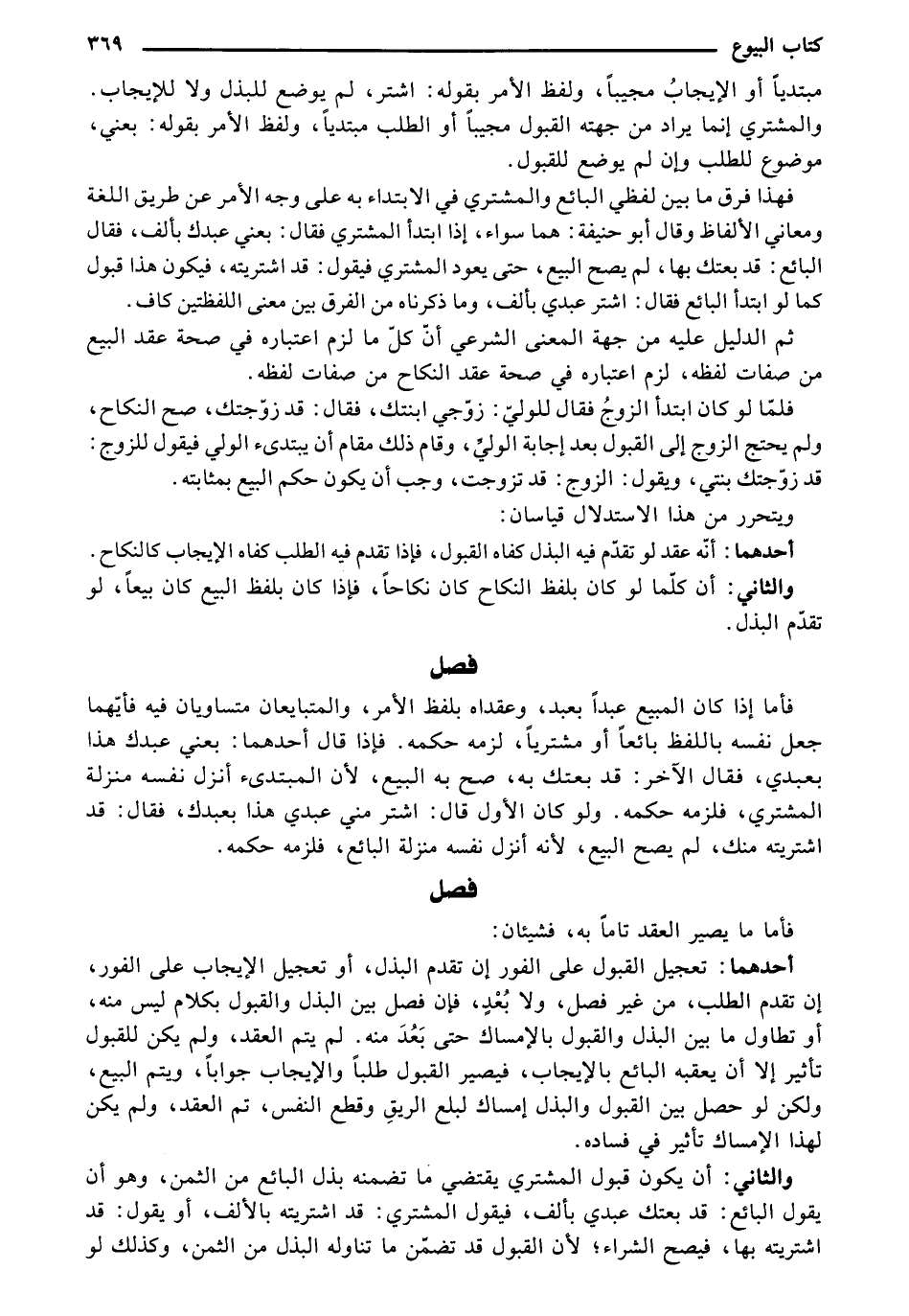أحدهما: تعجيل القبول على الفور إن تقدم البذل، أو تعجيل الإيجاب على الفور، إن تقدم الطلب، من غير فصل، ولا بعد، فإن فصل بين البذل والقبول بكلام ليس منه، أو تطاول ما بين البذل والقبول بالإمساك حتى بعد منه. لم يتم العقد، ولم يكن للقبول تأثير إلا أن يعقبه البائع بالإيجاب، فيصير القبول طلباً والإيجاب جواباً، ويتم البيع، ولكن لو حصل بين القبول والبذل إمساك لبلع الريق وقطع النفس، تم العقد، ولم يكن لهذا الإمساك تأثير في فساده.